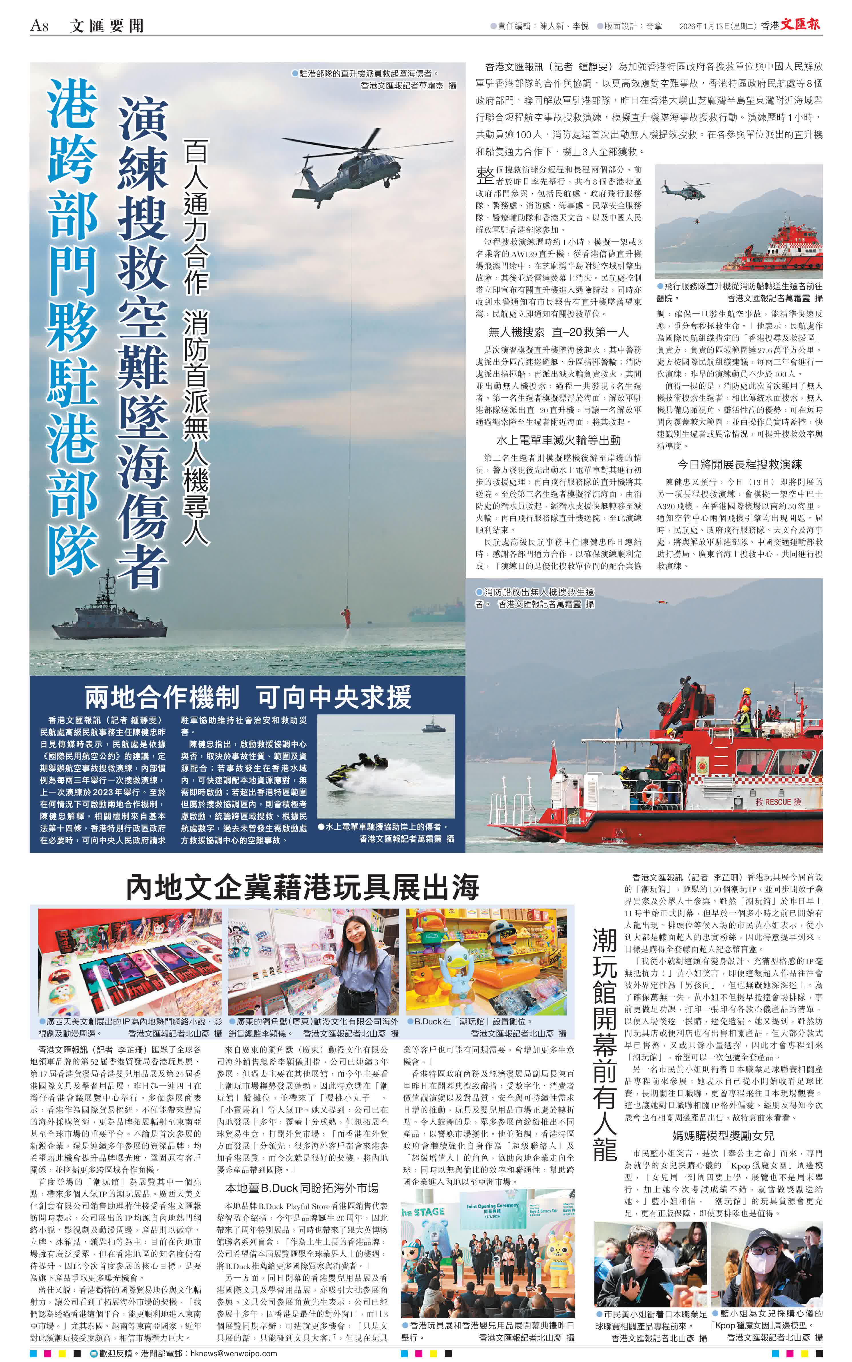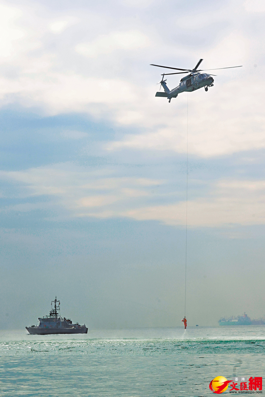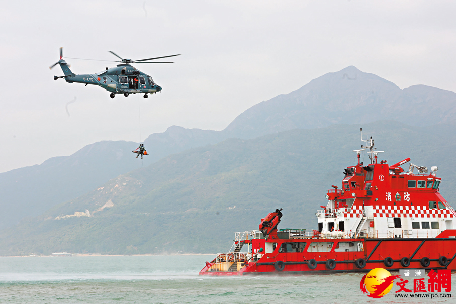香港文匯報訊(記者 鍾靜雯)為加強香港特區政府各搜救單位與中國人民解放軍駐香港部隊的合作與協調,以更高效應對空難事故,香港特區政府民航處等8個政府部門,聯同解放軍駐港部隊,昨日在香港大嶼山芝麻灣半島望東灣附近海域舉行聯合短程航空事故搜救演練,模擬直升機墜海事故搜救行動。演練歷時1小時,共動員逾100人,消防處還首次出動無人機提效搜救。在各參與單位派出的直升機和船隻通力合作下,機上3人全部獲救。