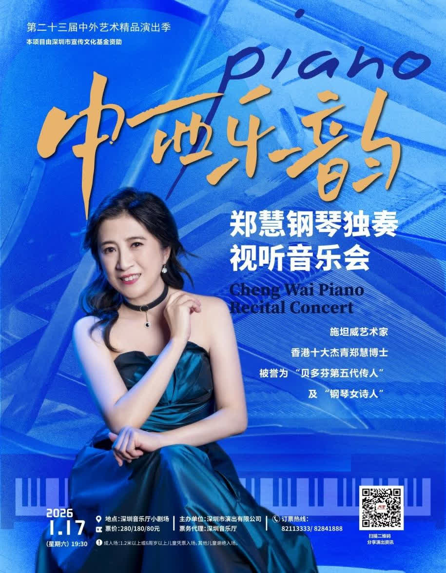 (香港文匯網記者 李薇)由香港著名施坦威藝術家、「香港十大傑青」鄭慧博士帶來的「中西樂韻——鄭慧鋼琴獨奏視聽音樂會」,將於2026年1月17日19:30在深圳音樂廳小劇場溫情奏響。這位被譽為「貝多芬第五代傳人」「鋼琴女詩人」的香港音樂名家,將攜多首中西經典曲目,為鵬城觀眾獻上一場兼具聽覺震撼與視覺美感的高水準音樂盛宴,續寫深港音樂文化交流的動人篇章。