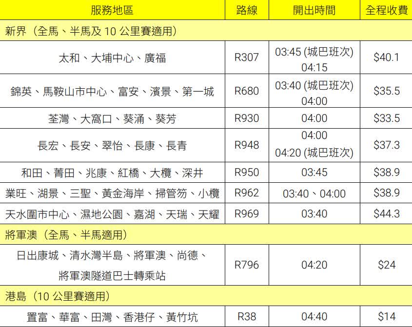 馬拉松特別路線覆蓋所有主要賽事起步點。全馬及半馬跑手可於海底隧道巴士轉乘站或尖東站下車,步行前往位於尖沙咀彌敦道的起步點;10公里賽事的跑手可於維多利亞公園站下車,步行前往位於東區走廊的起步點。詳情如下: