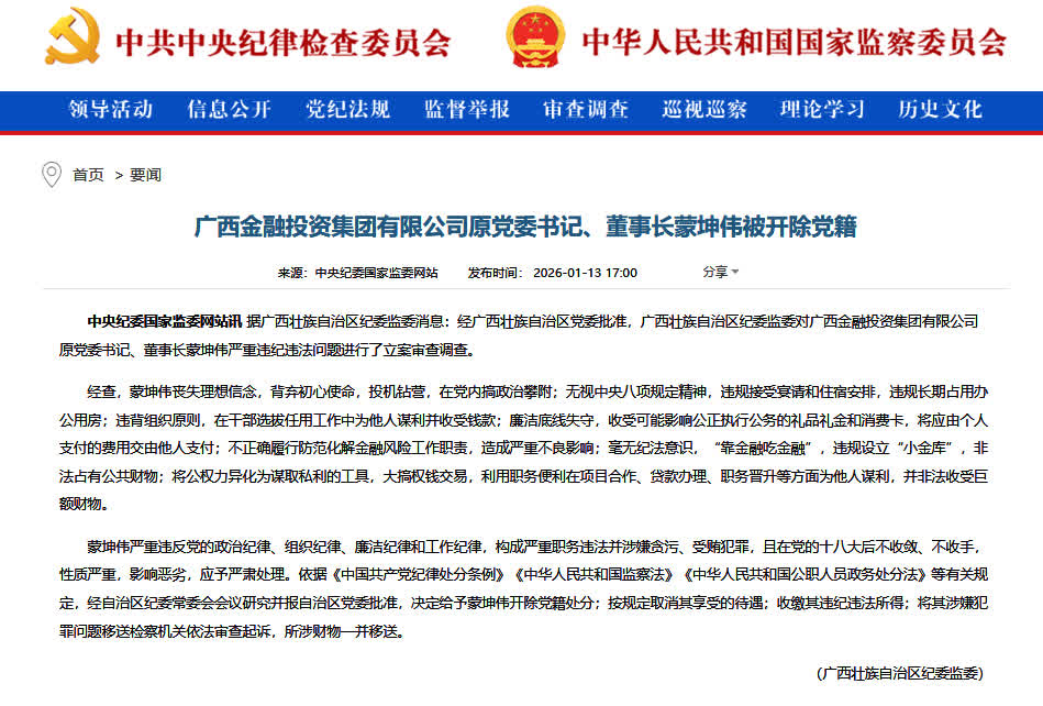據廣西壯族自治區紀委監委消息:經廣西壯族自治區黨委批准,廣西壯族自治區紀委監委對廣西金融投資集團有限公司原黨委書記、董事長蒙坤偉嚴重違紀違法問題進行了立案審查調查。