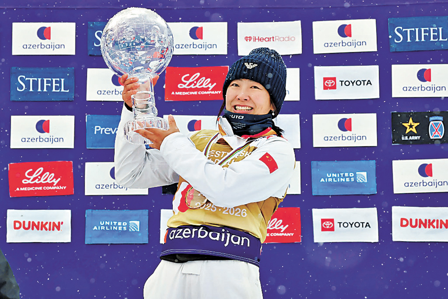 2025-2026賽季國際雪聯自由式滑雪空中技巧世界盃昨日(13日)在美國普萊西德湖收官。中國男子選手李心鵬奪得個人賽季首冠。孫佳旭與徐夢桃則憑積分優勢,分別獲得本賽季男、女子世界盃總冠軍。圖為徐夢桃捧起象徵總冠軍的水晶球獎盃。