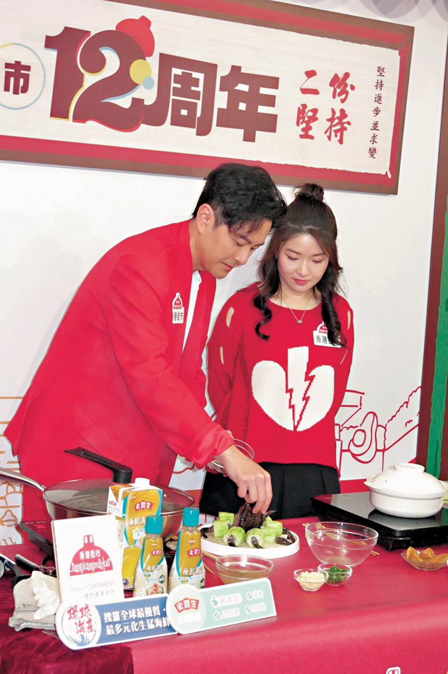 香港文匯報訊(記者 阿祖)蕭正楠(阿蕭)與已故演員許紹雄的女兒許惠菁(Charmaine)昨日出席街市新春活動,兩人即席下廚煮賀年菜式一顯廚藝,但Charmine不慎被卡紙𠝹傷手背,要處理傷口貼上膠布;阿蕭則收到粉絲所送的一盒玩具車給他兒子「蕭哈哈」。