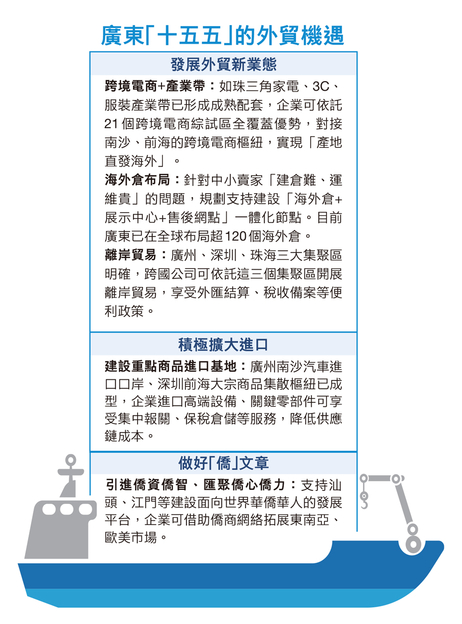 廣東省「十五五」規劃建議明確提出「建設貿易強省」「促進外貿穩量提質」的目標,強調統籌推進高質量「引進來」和高水平「走出去」。廣東省商務廳副廳長孫斌表示,「過去5年來,廣東深入實施『粵貿全球』計劃,支持10萬多家次企業出海參展。今年廣東將統籌外貿企業高水平『走出去』,讓更多廣東企業在全球市場搶訂單。」