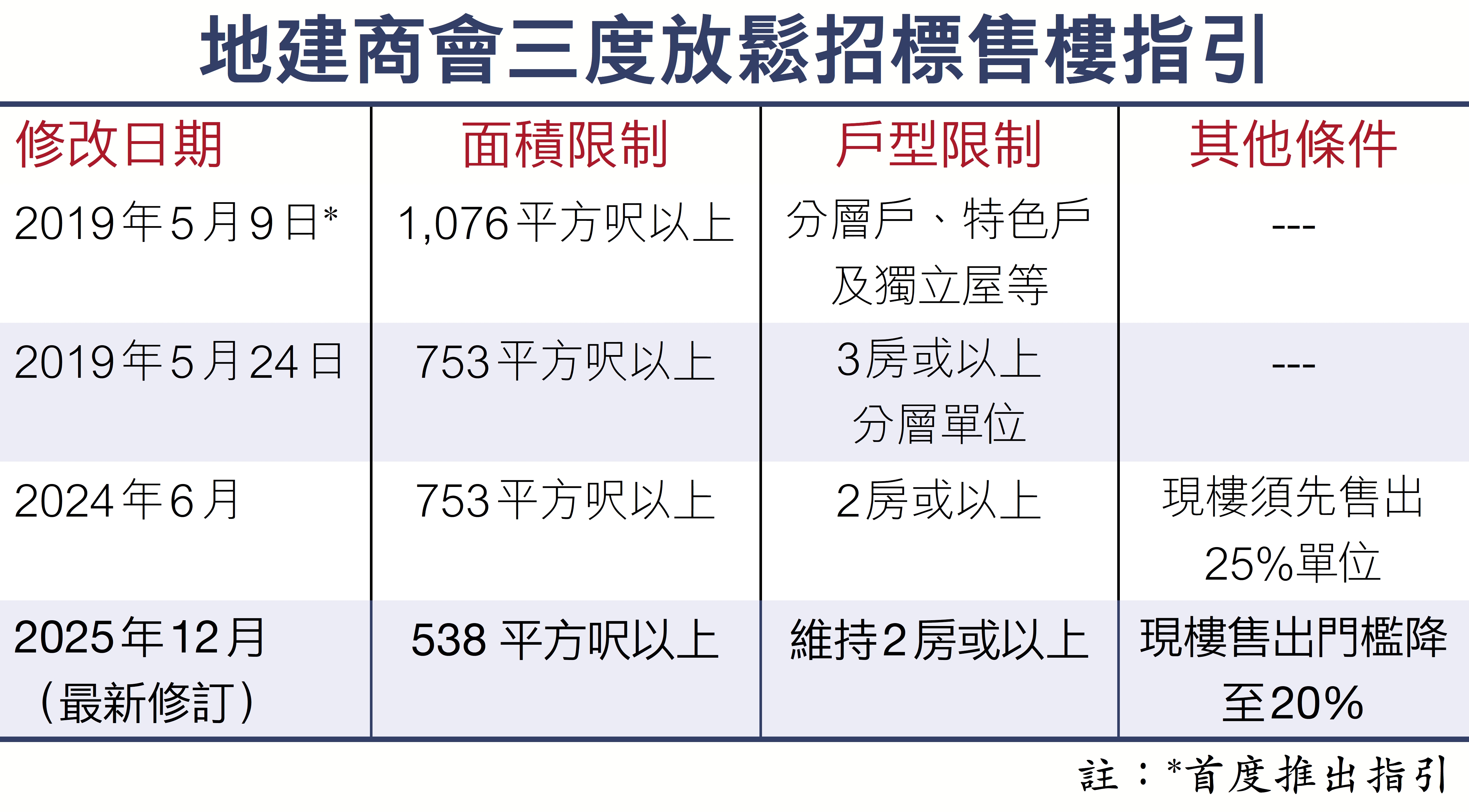 地建商會其後在2024年6月作出修改,加入項目入伙後至少沽出全盤25%單位才可標售,而單位面積則維持不少於753平方呎,同時取消3房或以上戶型限制,及2房以下不可作標售,但不少於753平方呎大2房屬可招標之列。