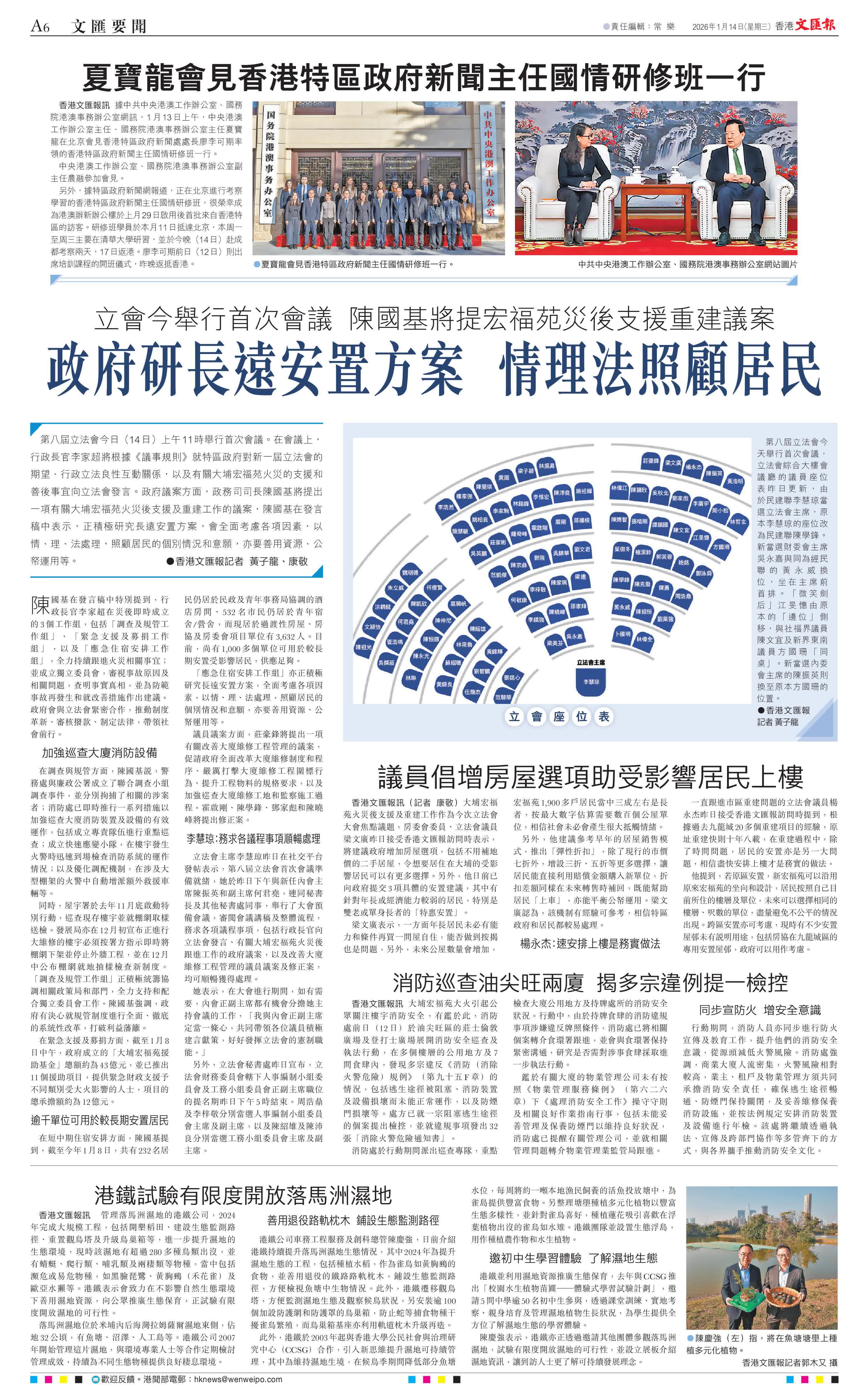 (香港文匯報記者 黃子龍、康敬)第八屆立法會今日(14日)上午11時舉行首次會議。在會議上,行政長官李家超將根據《議事規則》就特區政府對新一屆立法會的期望、行政立法良性互動關係,以及有關大埔宏福苑火災的支援和善後事宜向立法會發言。政府議案方面,政務司司長陳國基將提出一項有關大埔宏福苑火災後支援及重建工作的議案,陳國基在發言稿中表示,正積極研究長遠安置方案,會全面考慮各項因素,以情、理、法處理,照顧居民的個別情況和意願,亦要善用資源、公帑運用等。
