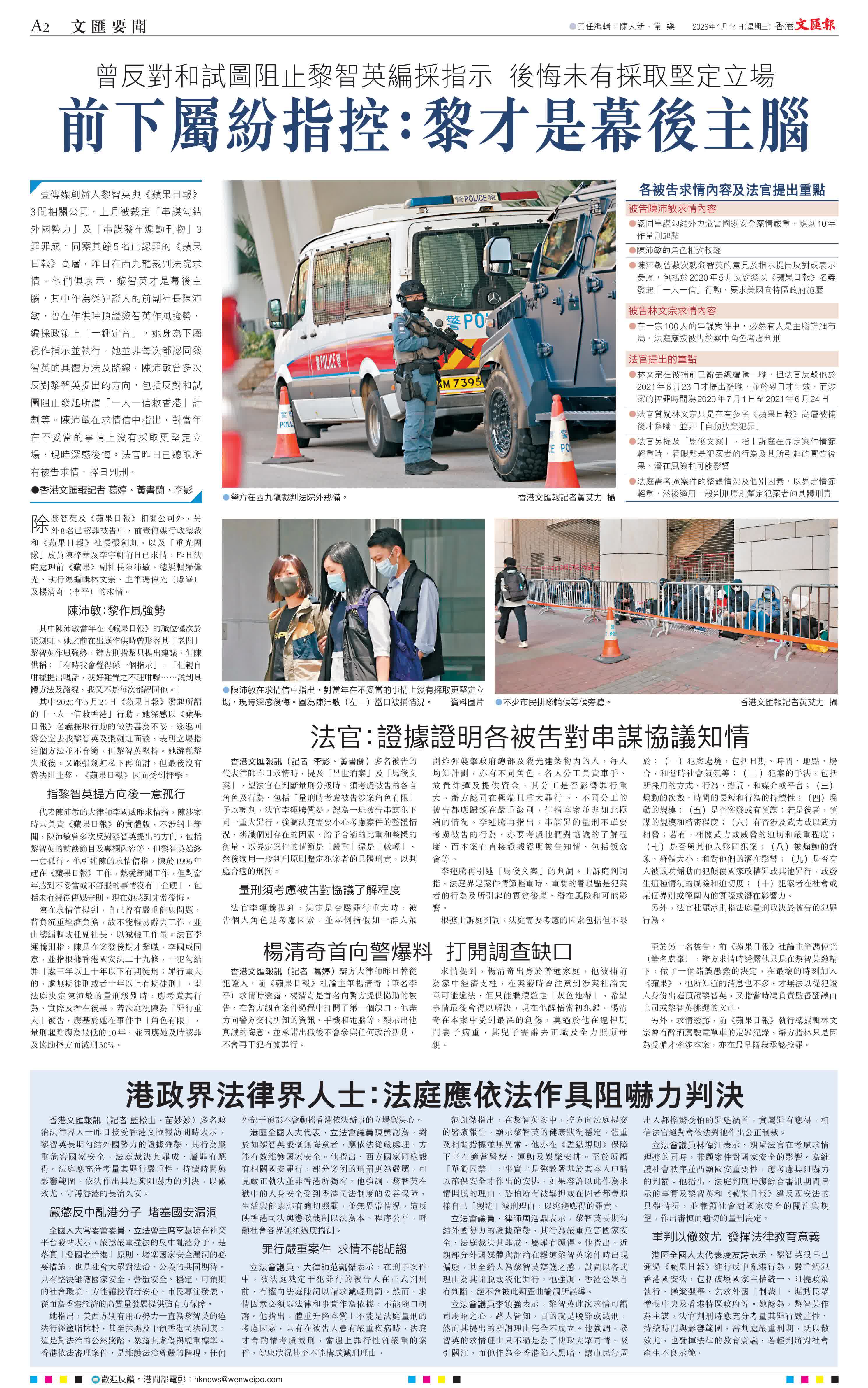 (香港文匯報記者 葛婷、黃書蘭、李影)壹傳媒創辦人黎智英與《蘋果日報》3間相關公司,上月被裁定「串謀勾結外國勢力」及「串謀發布煽動刊物」3罪罪成,同案其餘5名已認罪的《蘋果日報》高層,昨日在西九龍裁判法院求情。他們俱表示,黎智英才是幕後主腦,其中作為從犯證人的前副社長陳沛敏,曾在作供時頂證黎智英作風強勢,編採政策上「一錘定音」,她身為下屬視作指示並執行,她並非每次都認同黎智英的具體方法及路線。陳沛敏曾多次反對黎智英提出的方向,包括反對和試圖阻止發起所謂「一人一信救香港」計劃等。陳沛敏在求情信中指出,對當年在不妥當的事情上沒有採取更堅定立場,現時深感後悔。法官昨日已聽取所有被告求情,擇日判刑。