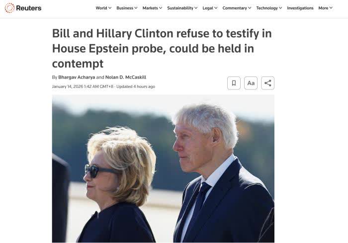 據中新網援引路透社報道,當地時間13日,美國前總統比爾·克林頓及妻子、前國務卿希拉里·克林頓拒絕在共和黨主導的國會針對愛潑斯坦的調查中作證,稱該調查是黨派鬥爭行為。