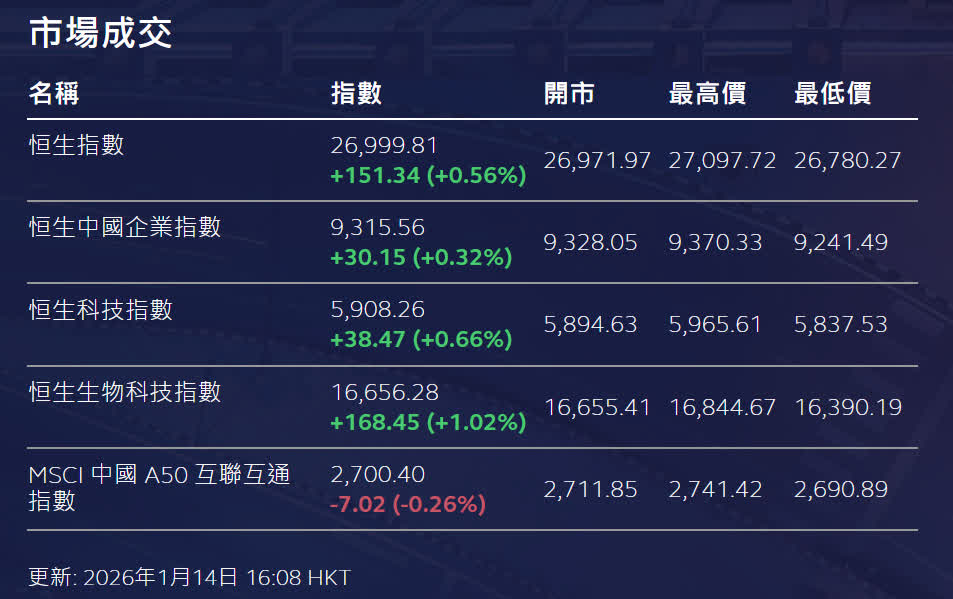 香港文匯報訊 港股再次放量上升,三大指數悉數錄漲。恒生指數收報26,999點,升151點或0.56%。國企指數升0.32%。恒生科技指數升0.66%。大市成交額增至3,404億元,連續三日超過3,000億元。