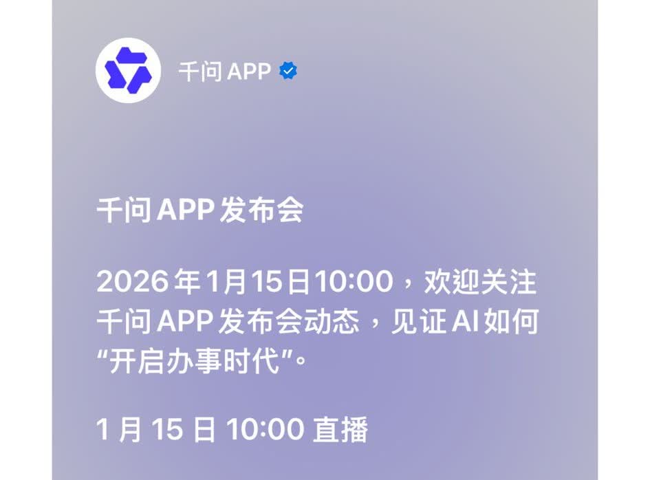 香港文匯報訊 據內媒《科創板日報》報道,阿里巴巴(9988)旗下千問C端月活躍用戶((MAU)已突破1億,在學生和白領人群中增長迅猛。報道並透露,千問於周四(15日)將發布重磅產品迭代。其後,阿里巴巴旗下官方微信號確認,1月15日早上10時將召開千問App發布會,邀請大家見證AI如何「開啟辦事時代」。