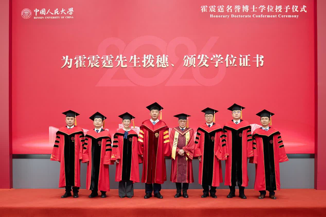 「霍震霆先生懷家國之情、擔時代之任、秉公益之心,是愛國愛港的傑出代表,是『一國兩制』方針的堅定踐行者,也是國家改革開放和體育事業的卓越貢獻者。」中國人民大學黨委書記張東剛在致辭中表示,授予霍震霆先生名譽博士學位,既是對他愛國愛港、為民利民貢獻的崇高致敬,更是對他與人民大學精神共振、使命共擔的高度認同。站在「十五五」規劃開局的歷史新起點,期待與霍震霆先生及港澳各界同胞一道,在新的歷史方位中團結奮鬥,堅決維護和助力港澳長期繁榮穩定;在新的發展坐標中深化合作,積極服務粵港澳大灣區建設;在新的世界格局中增進交流,促進全世界人民相知相親、不同文明和合共生,為「一國兩制」事業行穩致遠注入新動力,為強國建設、民族復興偉業貢獻新力量。