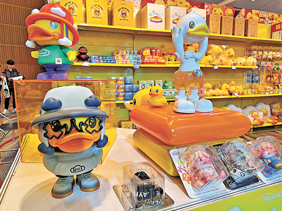 在「小黃鴨」展區,一個特殊的限量版小黃鴨玩偶吸引了不少觀眾的目光,這隻特別的「小黃鴨」用雙手將自己的頭部高高舉起,與傳統的小黃鴨形象頗有不同,這是早前為慶祝「小黃鴨」18周年而推出的聯名產品,全球僅有150套。小黃鴨德盈控股總經理及執行董事張展耀解釋道:「我們希望做一個特別的東西去紀念這個時刻。它的概念是希望成年後仍能保持兒童心態。」這個設計——將頭舉起的動作和可拉開的頭部,寓意「放飛自我」。作為從香港誕生的本土創意IP,小黃鴨IP的知名度與覆蓋率在整個中國市場都堪稱成功,這也得益於其始終保持敢於「放飛自我」的勇氣。