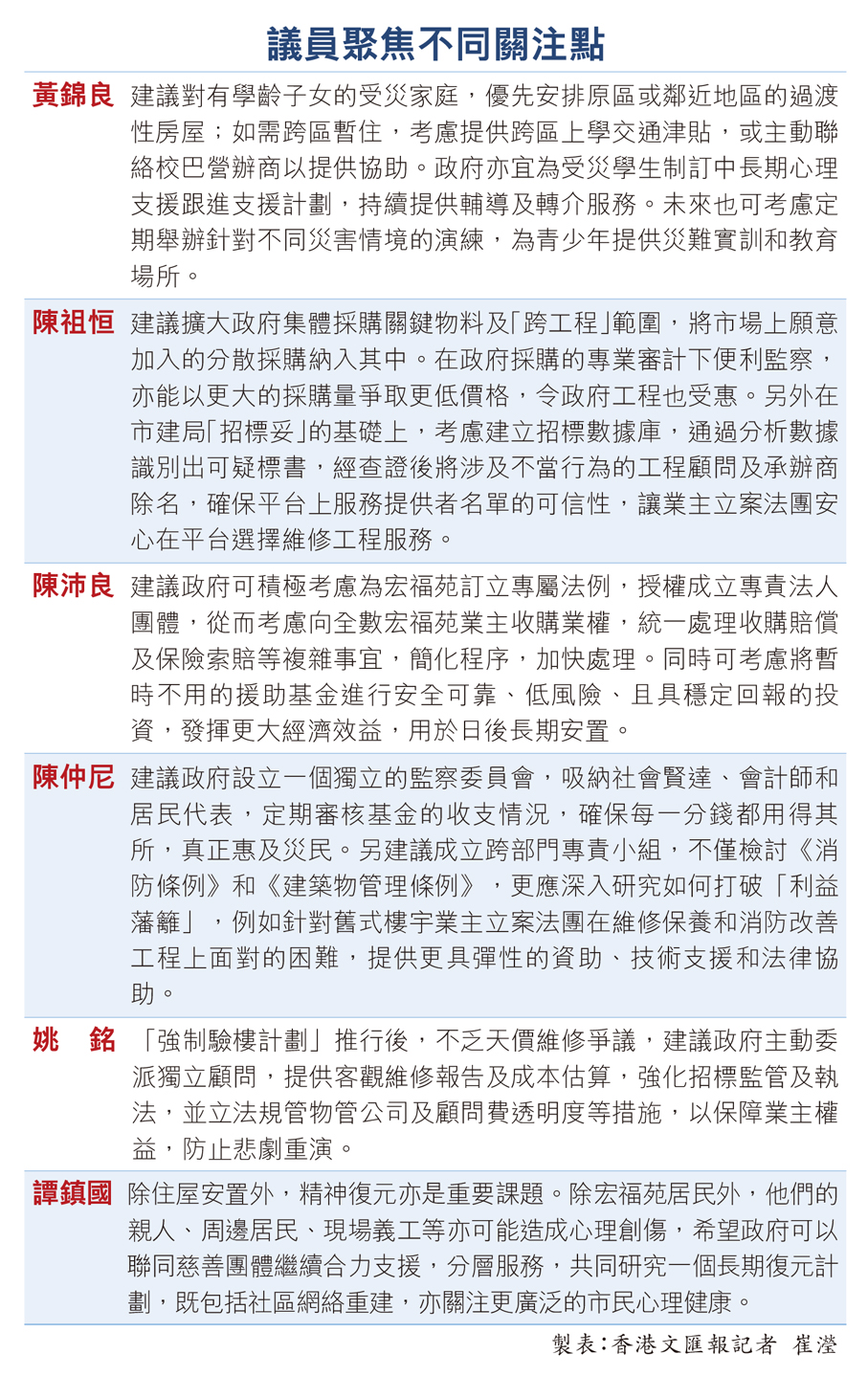 大埔宏福苑大火的慘痛教訓,揭示了舊樓維修及圍標問題的嚴重性。香港特區政府昨日提出五大改革措施,包括提升大型維修工程的規範及透明度,並加強市建局「招標妥」服務的角色,期望藉此遏止圍標問題。香港文匯報記者昨日詢問多位其他屋苑業主的意見,他們普遍讚賞政府提出的改革方案,認為是撥亂反正的第一步,並需時驗證新措施的成效,促請政府加強對小業主的維修支援,以及加大力度重罰圍標,避免有不法集團透過不斷改名,借屍還魂。