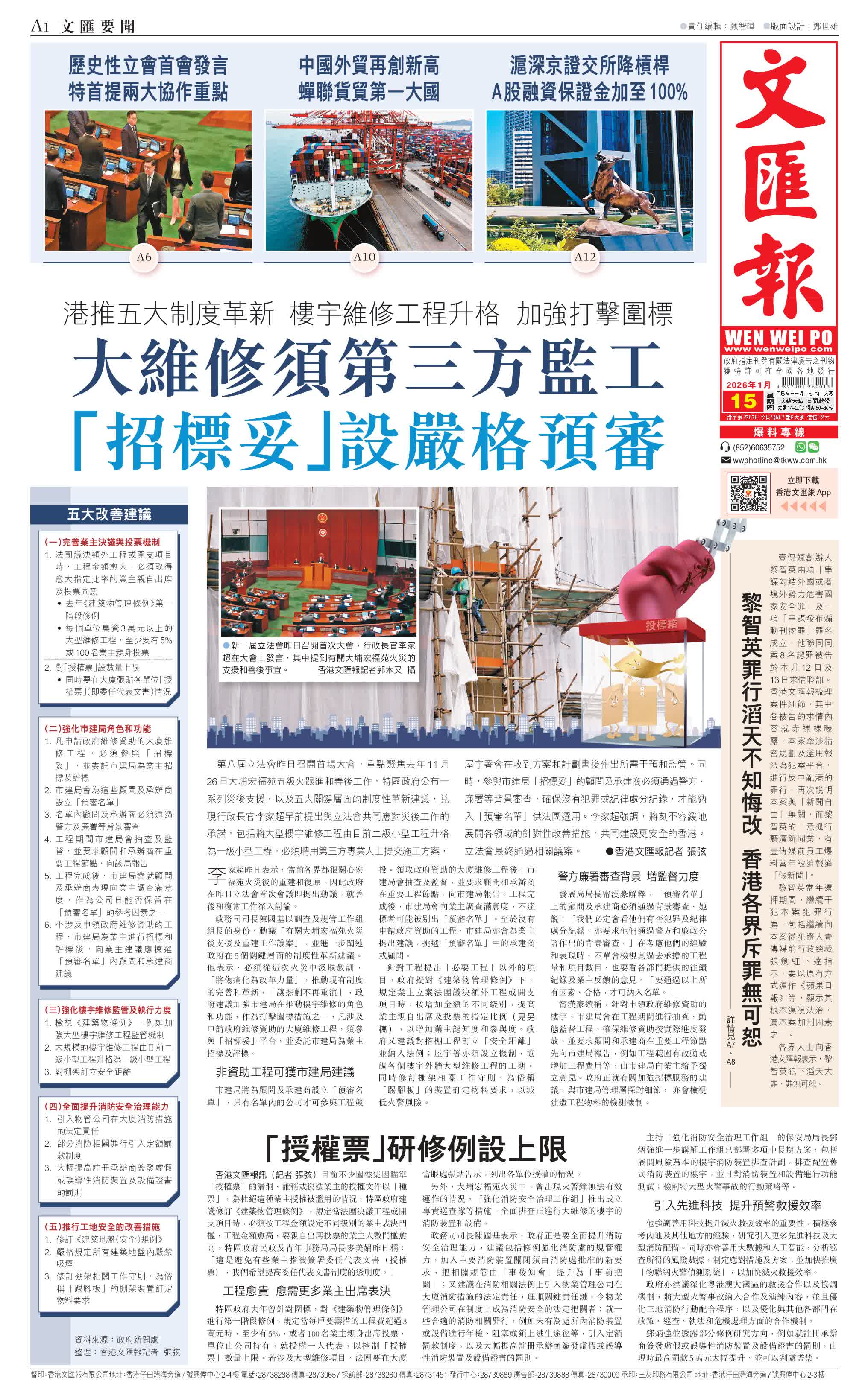 香港文匯報訊(記者 張弦)第八屆立法會昨日召開首場大會,重點聚焦去年11月26日大埔宏福苑五級火跟進和善後工作,特區政府公布一系列災後支援,以及五大關鍵層面的制度性革新建議,兌現行政長官李家超早前提出與立法會共同應對災後工作的承諾,包括將大型樓宇維修工程由目前二級小型工程升格為一級小型工程,必須聘用第三方專業人士提交施工方案,屋宇署會在收到方案和計劃書後作出所需干預和監管。同時,參與市建局「招標妥」的顧問及承建商必須通過警方、廉署等背景審查,確保沒有犯罪或紀律處分紀錄,才能納入「預審名單」供法團選用。李家超強調,將刻不容緩地展開各領域的針對性改善措施,共同建設更安全的香港。立法會最終通過相關議案。