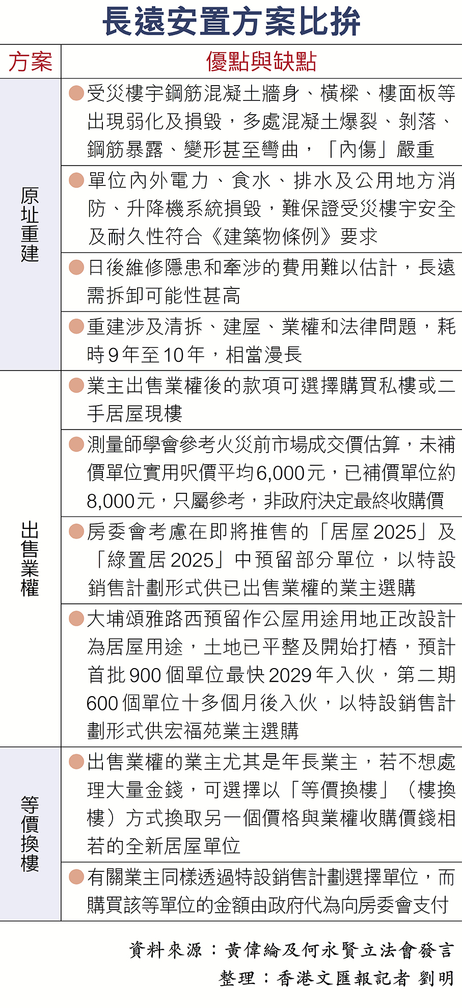 (記者 張弦)特區政府正透過「一戶一社工」以問卷了解大埔宏福苑受影響業主及居民對長遠住宿安排的想法和意見,政府強調要讓受影響居民「有得揀」,會努力提供多項選擇,不過由於大廈經歷烈火焚燒,宏福苑七座受災樓宇嚴重「內傷」,長遠需要拆卸的可能性高,「原址重建」方案需時或9年至10年,相較其他選項時間更長,若已出售業權的宏福苑業主選購大埔頌雅路西居屋,等候時間更短,生活配套亦相對完備。