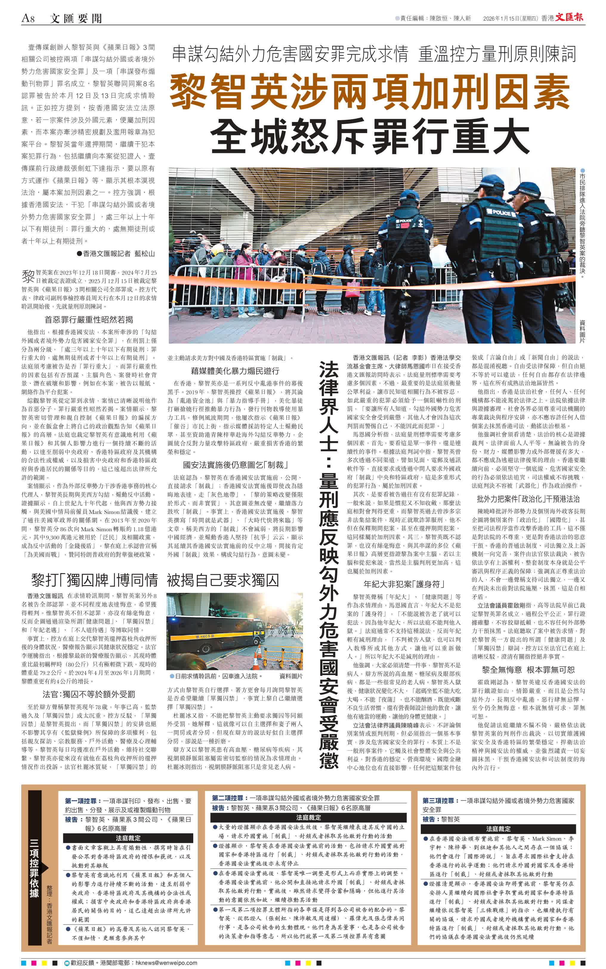 黎智英案在2023年12月18日開審,2024年7月25日被裁定表證成立,2025月12月15日被裁定黎智英與《蘋果日報》3間相關公司全部罪成。控方代表、律政司副刑事檢控專員周天行在本月12日的求情聆訊開始後,先就量刑原則陳詞。