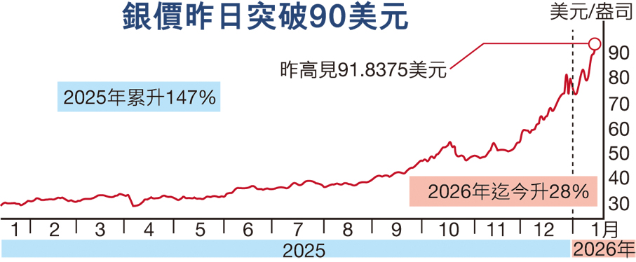 香港文匯報訊(記者 周曉菁)金屬價格延續年初強勁開局,昨日黃金、白銀、銅和錫的價格均創出歷史新高。尤其白銀價格一度上漲5.3%,首次突破每盎司90美元大關。CompaniesMarketCap平台數據顯示,受銀價提振,白銀總市值首次上探5萬億美元大關,已超越芯片商英偉達成為全球第二大資產,黃金則以32.162萬億美元市值穩居榜首,英偉達以4.523萬億美元的市值落至第三。市場相信,美國進一步降息及中國金融市場情緒復甦將繼續提振金屬價格。