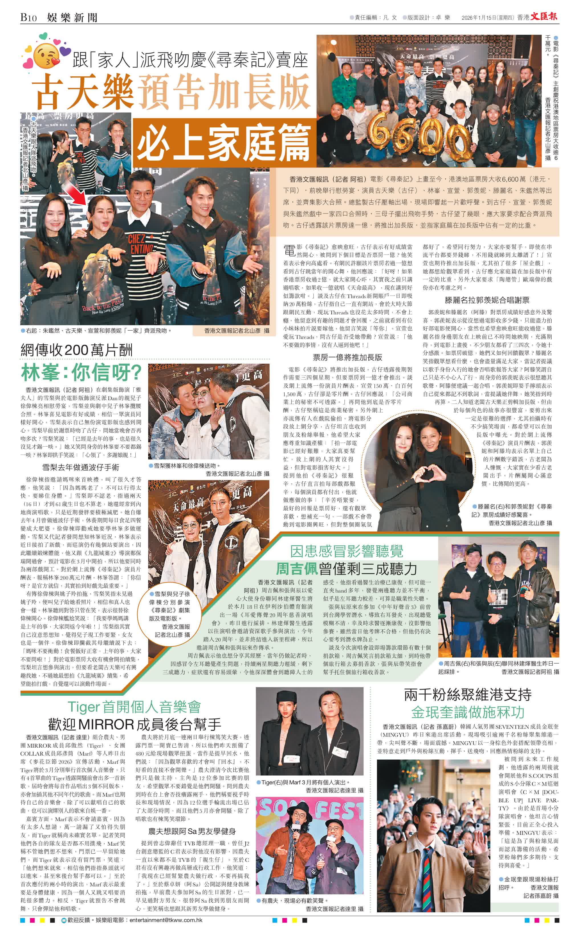 香港文匯報訊(記者 阿祖)電影《尋秦記》上畫至今,港澳地區票房大收6,600萬(港元,下同),前晚舉行慰勞宴,演員古天樂(古仔)、林峯、宣萱、郭羨妮、滕麗名、朱鑑然等出席,並齊集影大合照。總監製古仔壓軸出場,現場即響起一片歡呼聲。到古仔、宣萱、郭羨妮與朱鑑然戲中一家四口合照時,三母子擺出飛吻手勢,古仔望了幾眼,應大家要求配合齊派飛吻。古仔透露該片票房達一億,將推出加長版,並指家庭篇在加長版中佔有一定的比重。