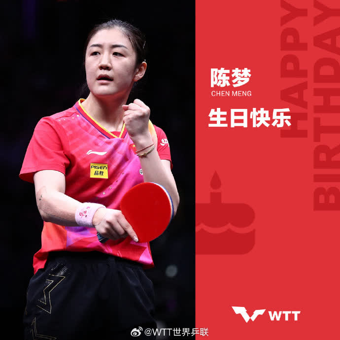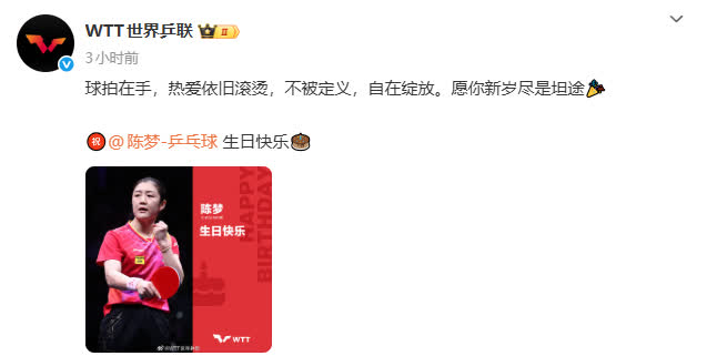 WTT世界乒聯於社交平台發文,祝乒乓球運動員陳夢生日快樂。貼文稱:「球拍在手,熱愛依舊滾燙,不被定義,自在綻放。願你新歲盡是坦途。」