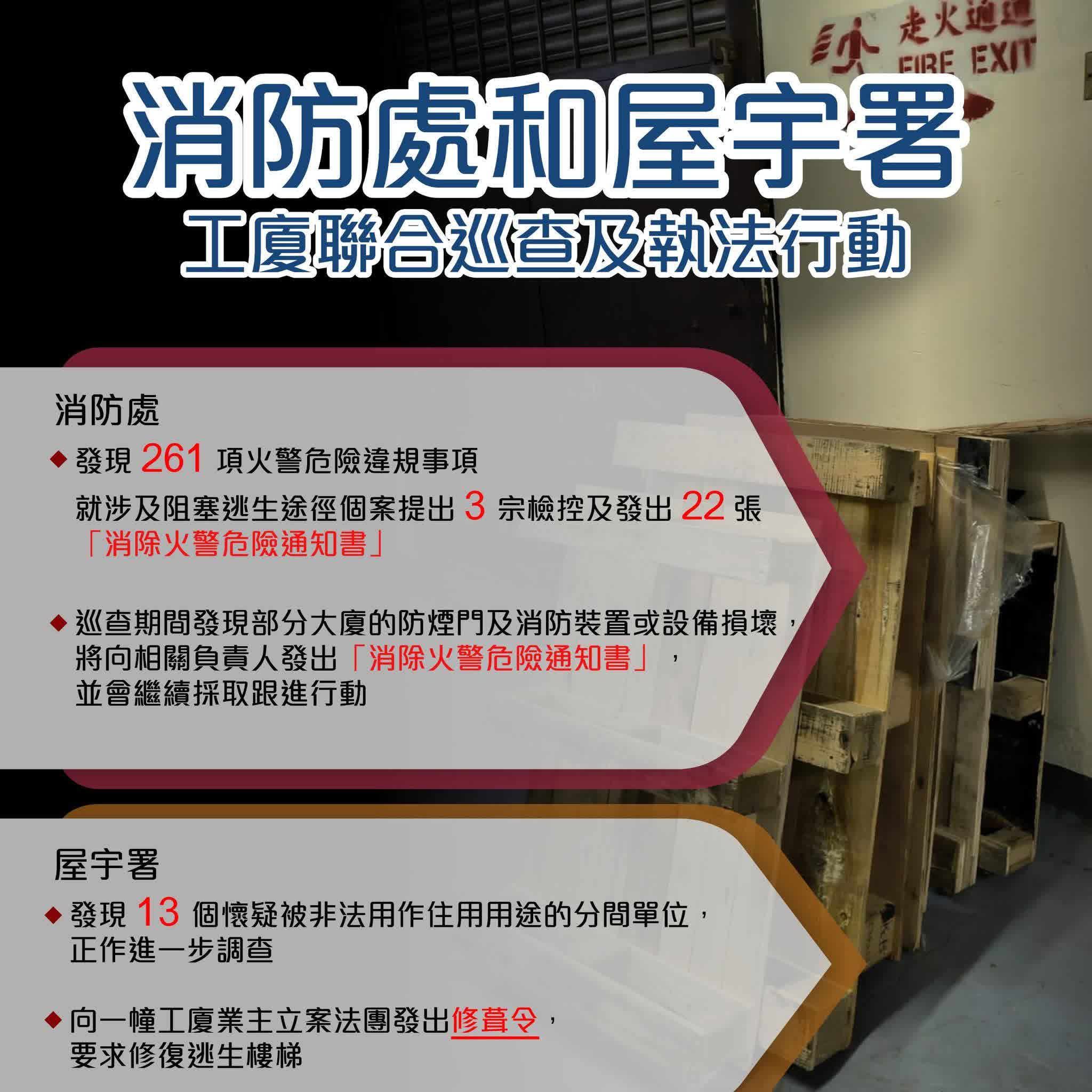 消防處及屋宇署人員於聯合行動中共巡查9幢位於九龍及新界多區的工業大廈,其間消防人員就不同火警危險發現共261項違規事項,包括逃生途徑被阻塞或鎖上;防煙門損壞、操作不良或被楔開;以及消防裝置或設備損壞或不在有效操作狀態等情況,已即時向負責人採取執法行動。