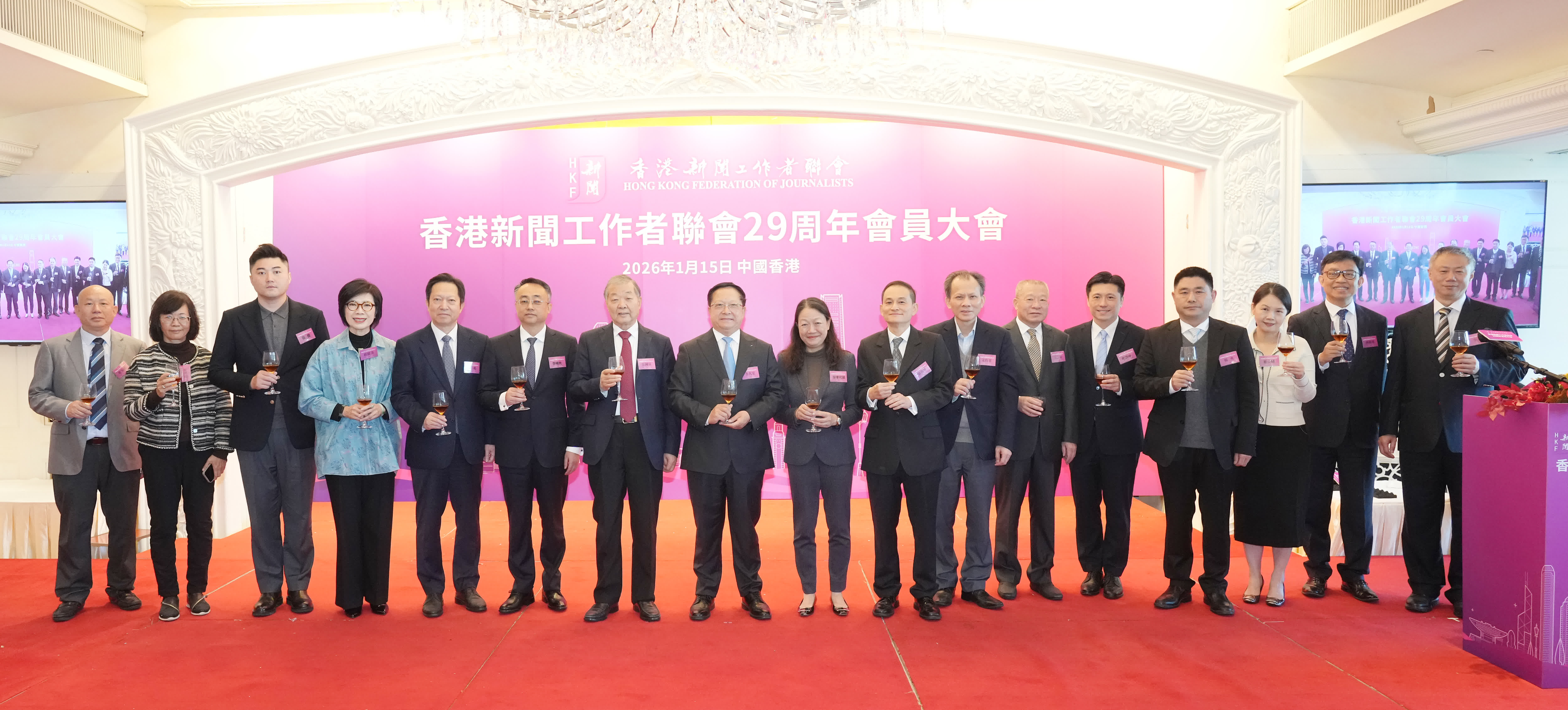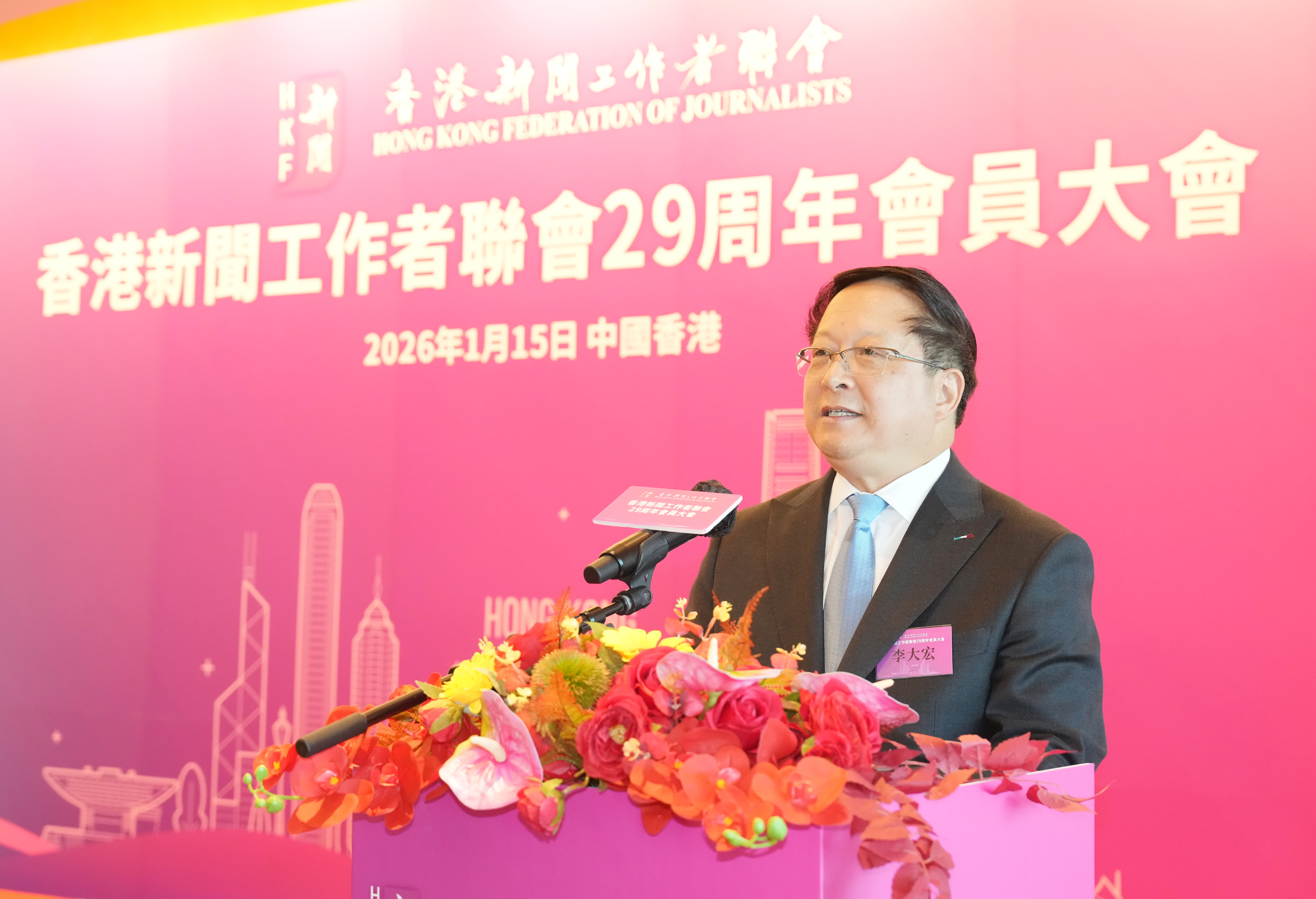 (大公文匯全媒體記者陸九如報道)香港新聞工作者聯會(「新聞聯」)成立 29 周年會員大會今日(15日)在中環大會堂舉行。新聞聯主席李大宏、會長張國良率理事會成員,與逾 400 名會員代表齊聚一堂。政府新聞處處長廖李可期、中央駐港聯絡辦宣傳文體部副部長李曙光、行政長官辦公室新聞統籌專員謝振中擔任主禮嘉賓。
