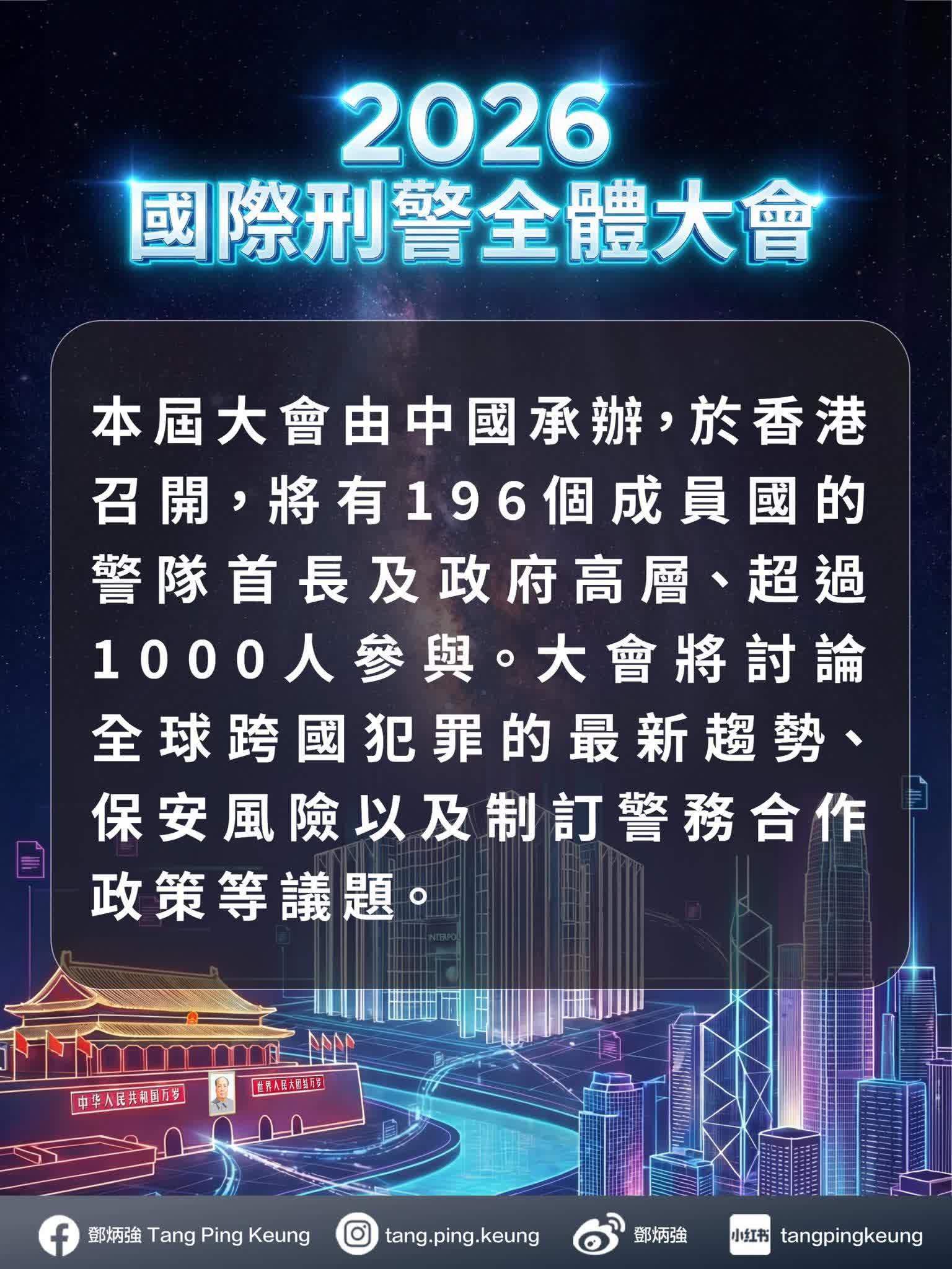 國際刑警組織全體大會不單是國際合作的重要平台,亦是我們展現警隊專業高效形象、向全世界說好香港故事的機會。香港必定會全力以赴,確保大會成功舉行。
