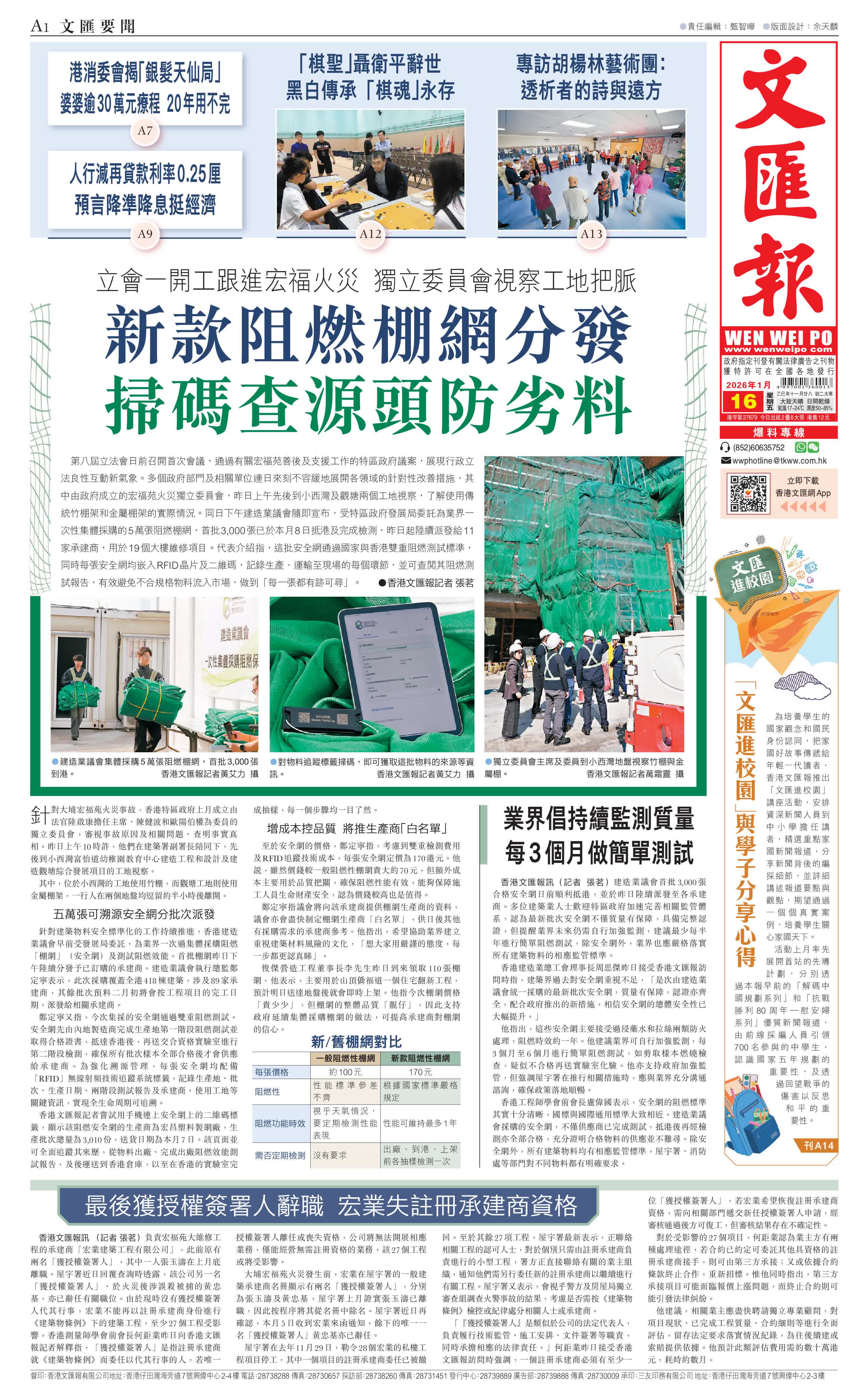 (香港文匯報記者 張茗)第八屆立法會日前召開首次會議,通過有關宏福苑善後及支援工作的特區政府議案,展現行政立法良性互動新氣象。多個政府部門及相關單位連日來刻不容緩地展開各領域的針對性改善措施,其中由政府成立的宏福苑火災獨立委員會,昨日上午先後到小西灣及觀塘兩個工地視察,了解使用傳統竹棚架和金屬棚架的實際情況。同日下午建造業議會隨即宣布,受特區政府發展局委託為業界一次性集體採購的5萬張阻燃棚網,首批3,000張已於本月8日抵港及完成檢測,昨日起陸續派發給11家承建商,用於19個大樓維修項目。代表介紹指,這批安全網通過國家與香港雙重阻燃測試標準,同時每張安全網均嵌入RFID晶片及二維碼,記錄生產、運輸至現場的每個環節,並可查閱其阻燃測試報告,有效避免不合規格物料流入市場,做到「每一張都有跡可尋」。