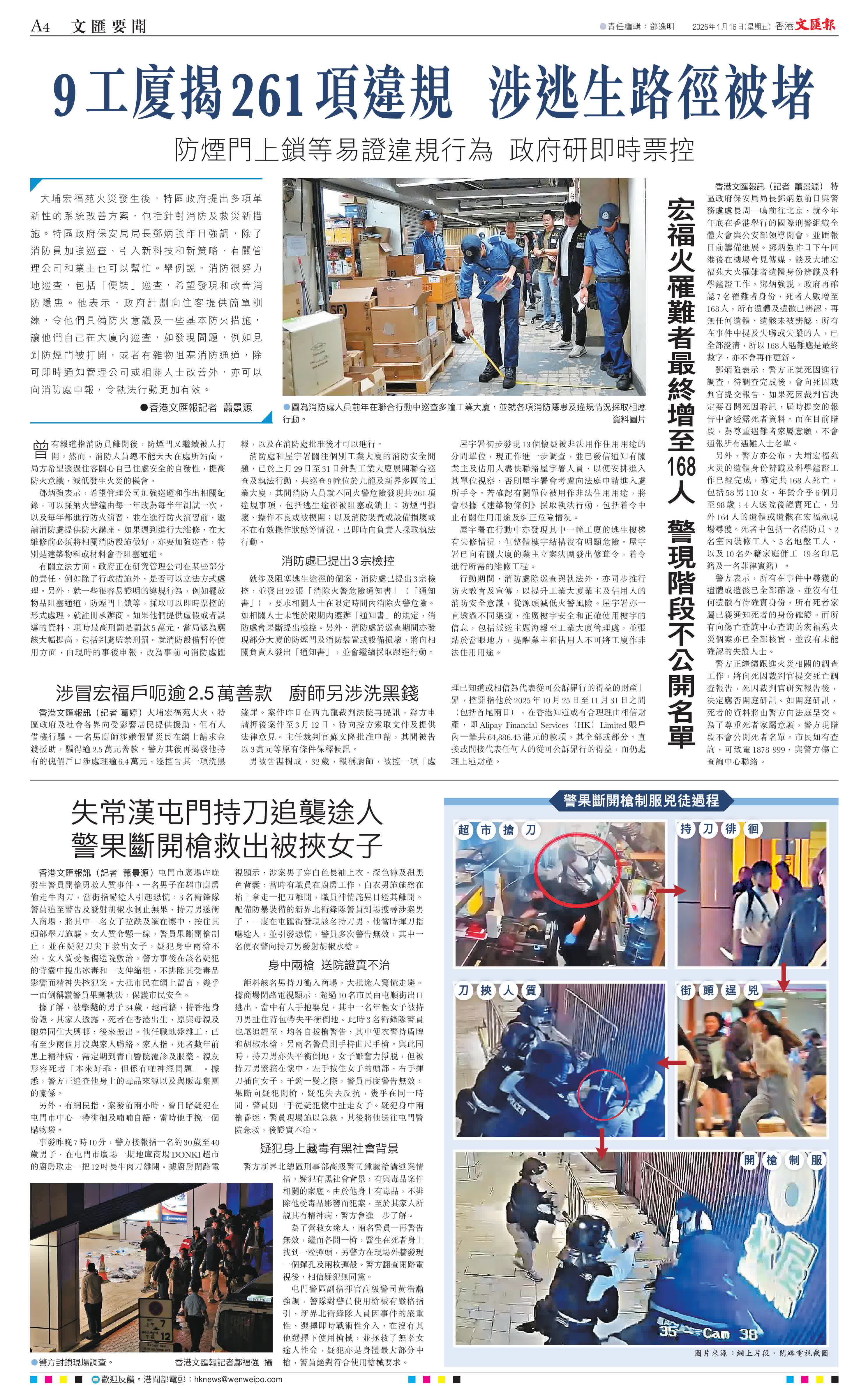 另外,警方亦公布,大埔宏福苑火災的遺體身份辨識及科學鑑證工作已經完成,確定共168人死亡,包括58男110女,年齡介乎6個月至98歲;4人送院後證實死亡,另外164人的遺體或遺骸在宏福苑現場尋獲。死者中包括一名消防員、2名室內裝修工人、5名地盤工人,以及10名外籍家庭傭工(9名印尼籍及一名菲律賓籍)。