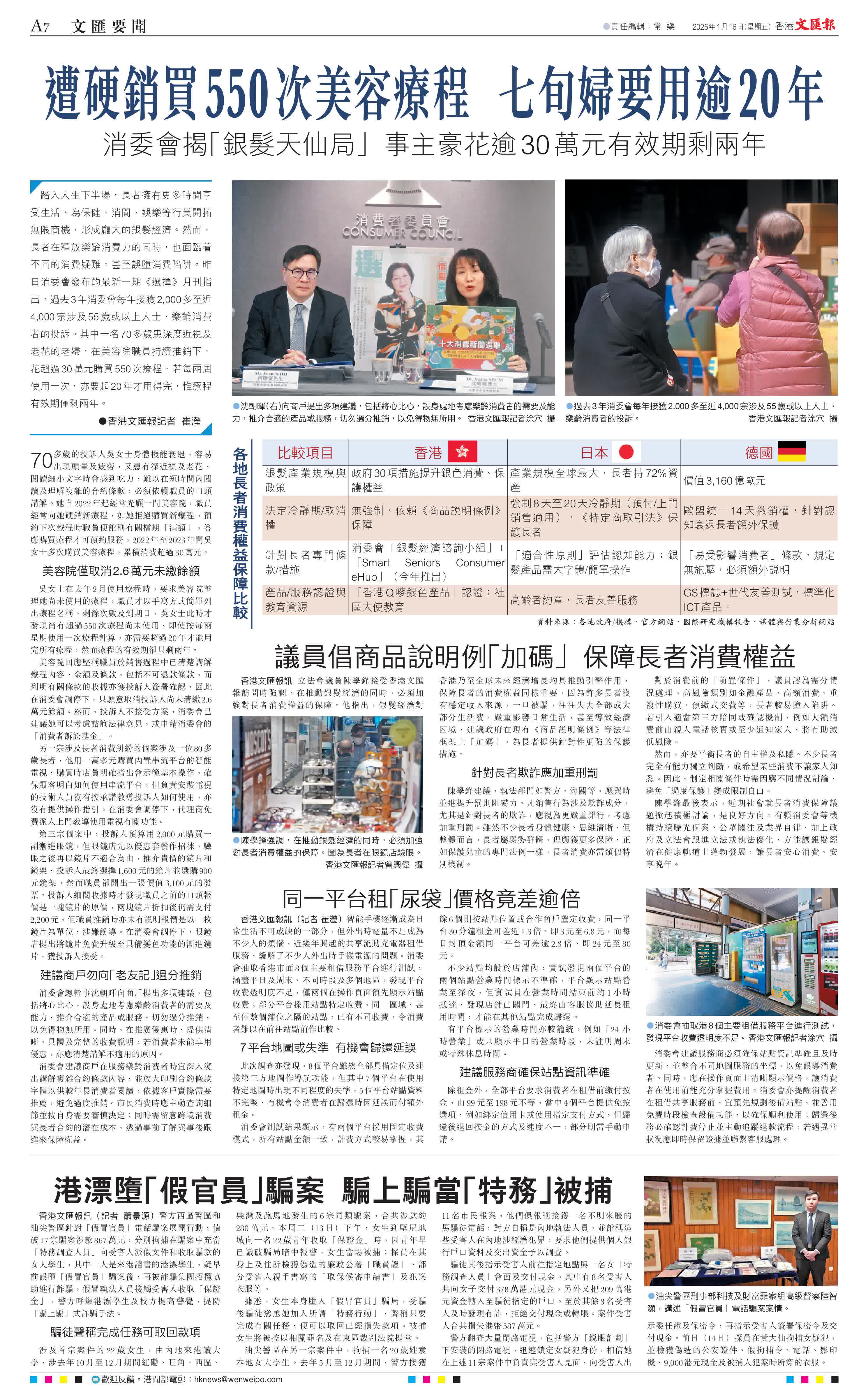 (香港文匯報記者 崔瀅)踏入人生下半場,長者擁有更多時間享受生活,為保健、消閒、娛樂等行業開拓無限商機,形成龐大的銀髮經濟。然而,長者在釋放樂齡消費力的同時,也面臨着不同的消費疑難,甚至誤墮消費陷阱。昨日消委會發布的最新一期《選擇》月刊指出,過去3年消委會每年接獲2,000多至近4,000宗涉及55歲或以上人士、樂齡消費者的投訴。其中一名70多歲患深度近視及老花的老婦,在美容院職員持續推銷下,花超過30萬元購買550次療程,若每兩周使用一次,亦要超20年才用得完,惟療程有效期僅剩兩年。