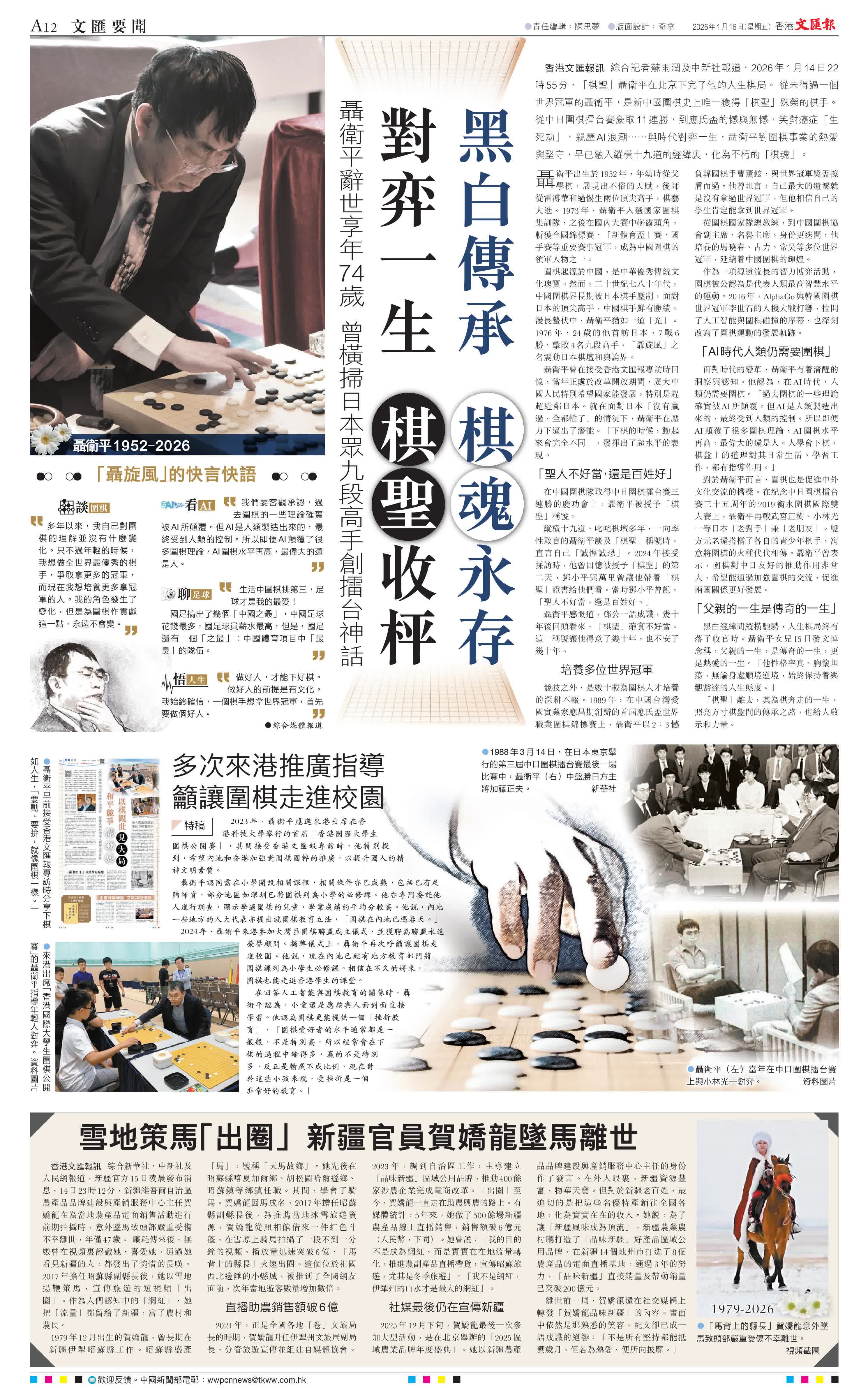 香港文匯報訊 綜合記者蘇雨潤及中新社報道,2026年1月14日22時55分,「棋聖」聶衛平在北京下完了他的人生棋局。 從未得過一個世界冠軍的聶衛平,是新中國圍棋史上唯一獲得「棋聖」殊榮的棋手。從中日圍棋擂台賽豪取11連勝,到應氏盃的憾與無憾,笑對癌症「生死劫」,親歷AI浪潮……與時代對弈一生,聶衛平對圍棋事業的熱愛與堅守,早已融入縱橫十九道的經緯裏,化為不朽的「棋魂」。