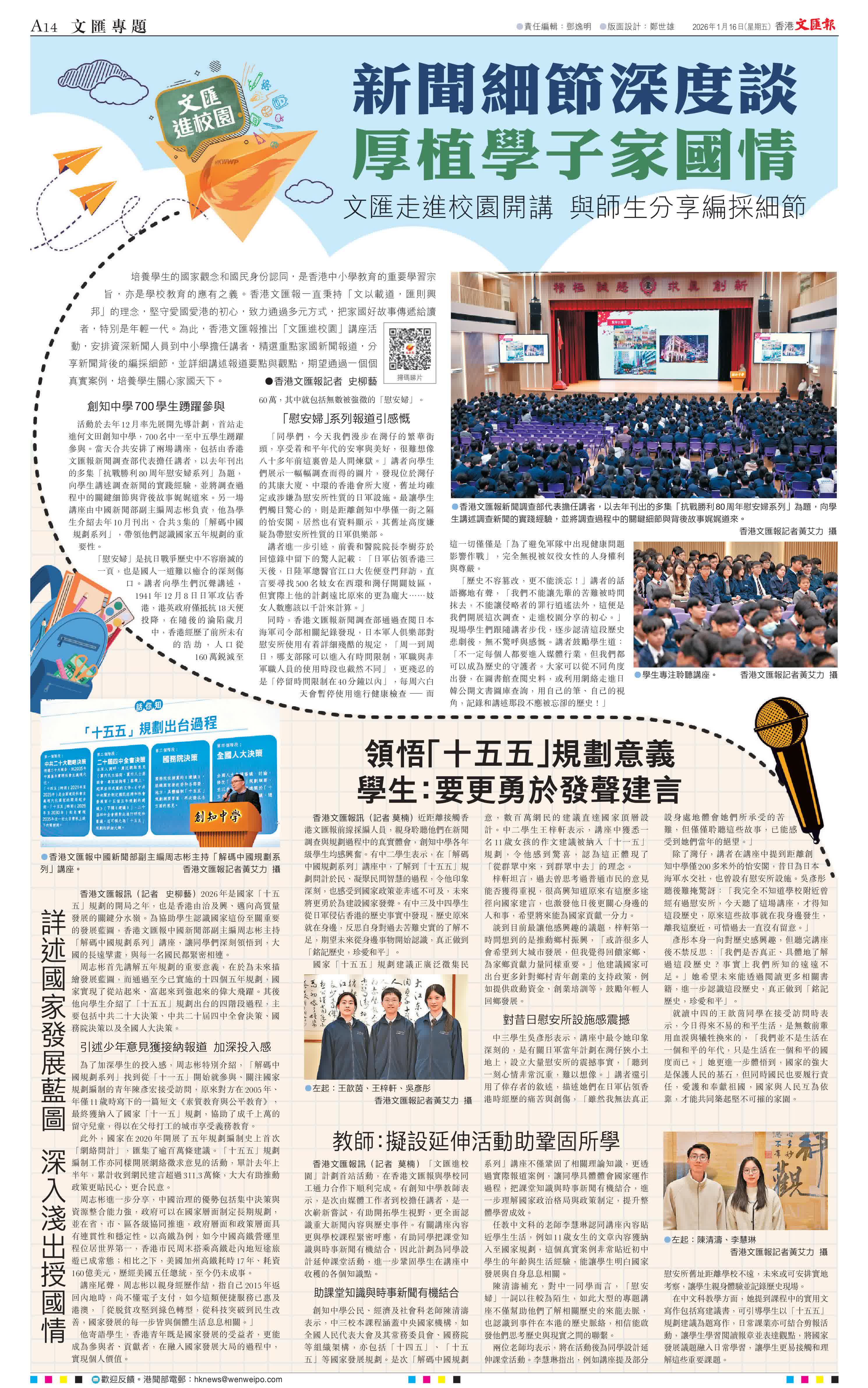 (香港文匯報記者 史柳藝)培養學生的國家觀念和國民身份認同,是香港中小學教育的重要學習宗旨,亦是學校教育的應有之義。香港文匯報一直秉持「文以載道,匯則興邦」的理念,堅守愛國愛港的初心,致力通過多元方式,把家國好故事傳遞給讀者,特別是年輕一代。為此,香港文匯報推出「文匯進校園」講座活動,安排資深新聞人員到中小學擔任講者,精選重點家國新聞報道,分享新聞背後的編採細節,並詳細講述報道要點與觀點,期望通過一個個真實案例,培養學生關心家國天下。