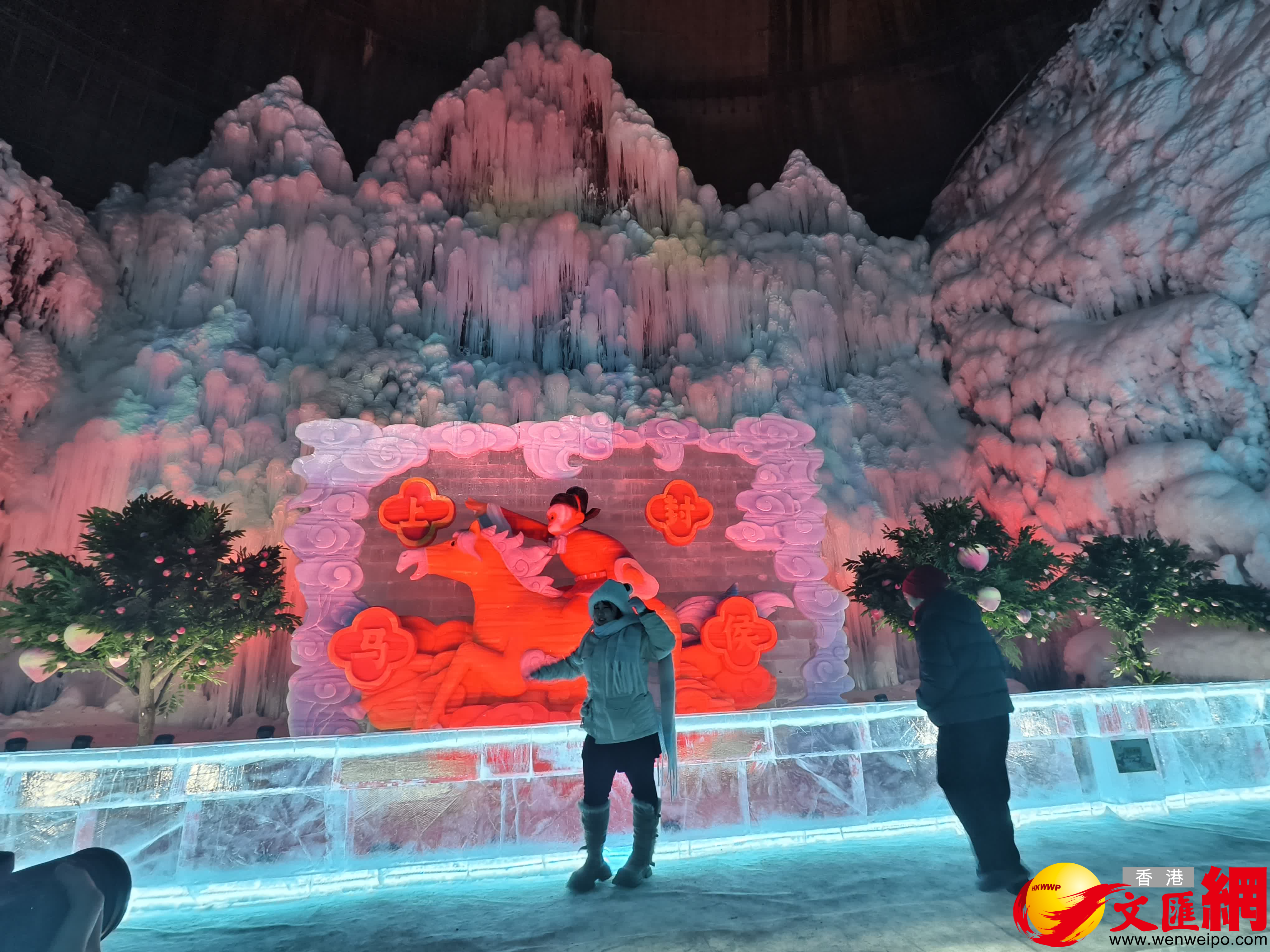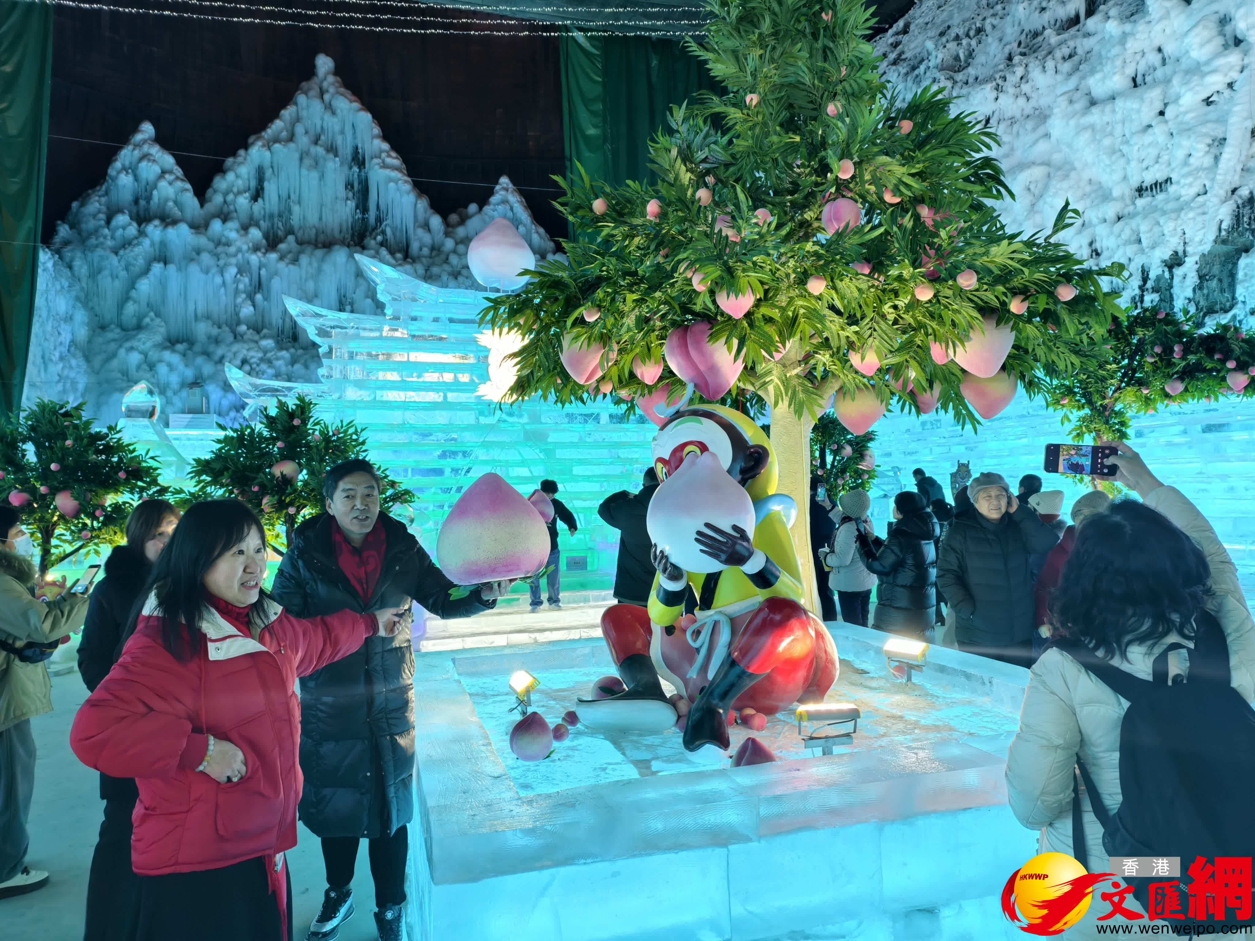 展區內還設置四處「名場面放映點」通過動態光影與靜態冰雕的融合,讓經典劇情鮮活再現。「馬上封侯」展區以冰川飛瀑花果山為背景,夜間投影營造「高山流水」效果,彩冰浮雕《馬上封侯》既為故事收官,又引出2026年馬年氛圍。「小時候最愛看《大鬧天宮》,現在在冰雕裏看到這些場景,瞬間勾起童年回憶!」遊客李先生興奮地告訴記者,冰燈主題氛圍感強,老少皆宜。