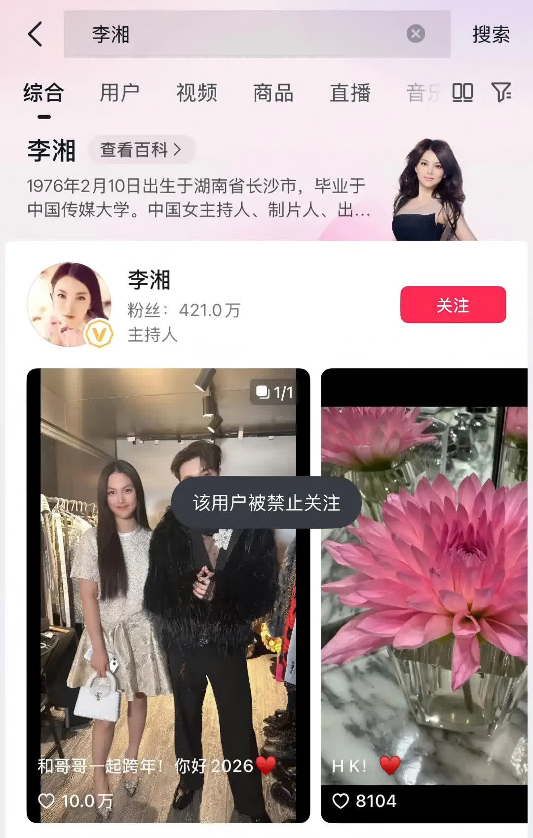 1月16日上午,李湘抖音賬號已被禁止關注。除李湘抖音頁面有顯著的「該用戶被禁止關注」字樣外,點擊「關注」按鈕後發現,抖音後台發送即時提示:「該用戶被禁止關注」。