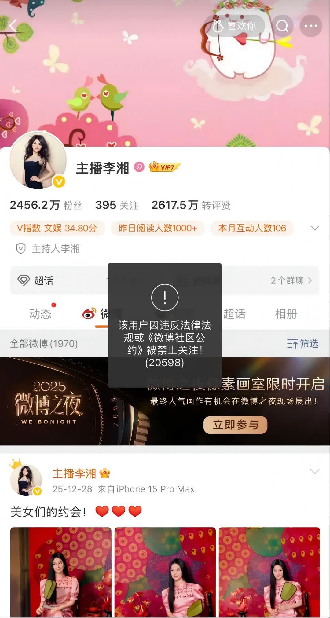 微博提示消息顯示:該用戶因違反法律法規或《微博社區公約》被禁止關注。