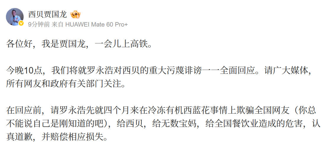 1月16日,西貝創始人賈國龍發文稱:「今晚10點將就羅永浩對西貝的重大污衊誹謗一一全面回應」。