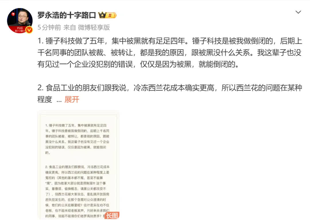 1月16日下午,@羅永浩的十字路口 發布長文回應近日西貝創始人賈國龍的相關言論。羅永浩在文章中稱,「鎚子科技做了五年,集中被黑就有足足四年。鎚子科技是被我做倒閉的,後期上千名同事的團隊被裁、被轉讓,都是我的原因,跟被黑沒什麼關係。我這輩子也沒有見過一個企業沒犯別的錯誤,僅僅是因為被黑,就能倒閉的。」