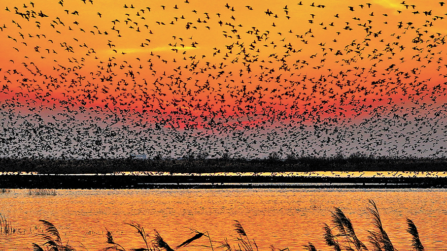 冬日的山東東營黃河三角洲,因為「鳥浪」奇觀而火爆出圈。這裏是黃河萬里奔流入海的地方,不僅被譽為鳥類的天堂、石油的寶庫,還有着「河海交匯」的世界級生態景觀,原始、磅礡、野性,卻又充滿了生命的張力。數十萬隻候鳥在天空翱翔,時而扶搖直上,時而俯衝直下,隊形不斷地變化。「鳥浪」像是一幅巨大的「沙畫」,從一縷青煙倏忽就流散為一條飄逸的綢帶,繼而化為鯤鵬……這一刻,《逍遙遊》中所說的「北冥有魚,其名為鯤」,在記者眼前真實再現。「鳥浪」迎面飛來,遮天蔽日,轟然作響,震撼不已。