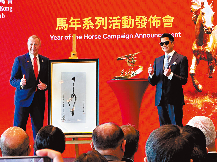 香港文匯報訊(記者 阿祖)郭富城(城城)獲馬會委任為「馬年大使」,昨日的「馬年系列活動發布會」上,同時舉行了委任儀式,並由馬會行政總裁應家柏將馬匹雕塑贈予城城,而城城特別將其親筆書寫「馬」字的藝術墨寶致送予馬會;著名攝影師夏永康及殿堂級服裝指導張叔平更聯手製作拍攝馬會「馬年大使」宣傳照片,並出動城城的愛駒「舞林密碼」首次同框拍攝廣告。