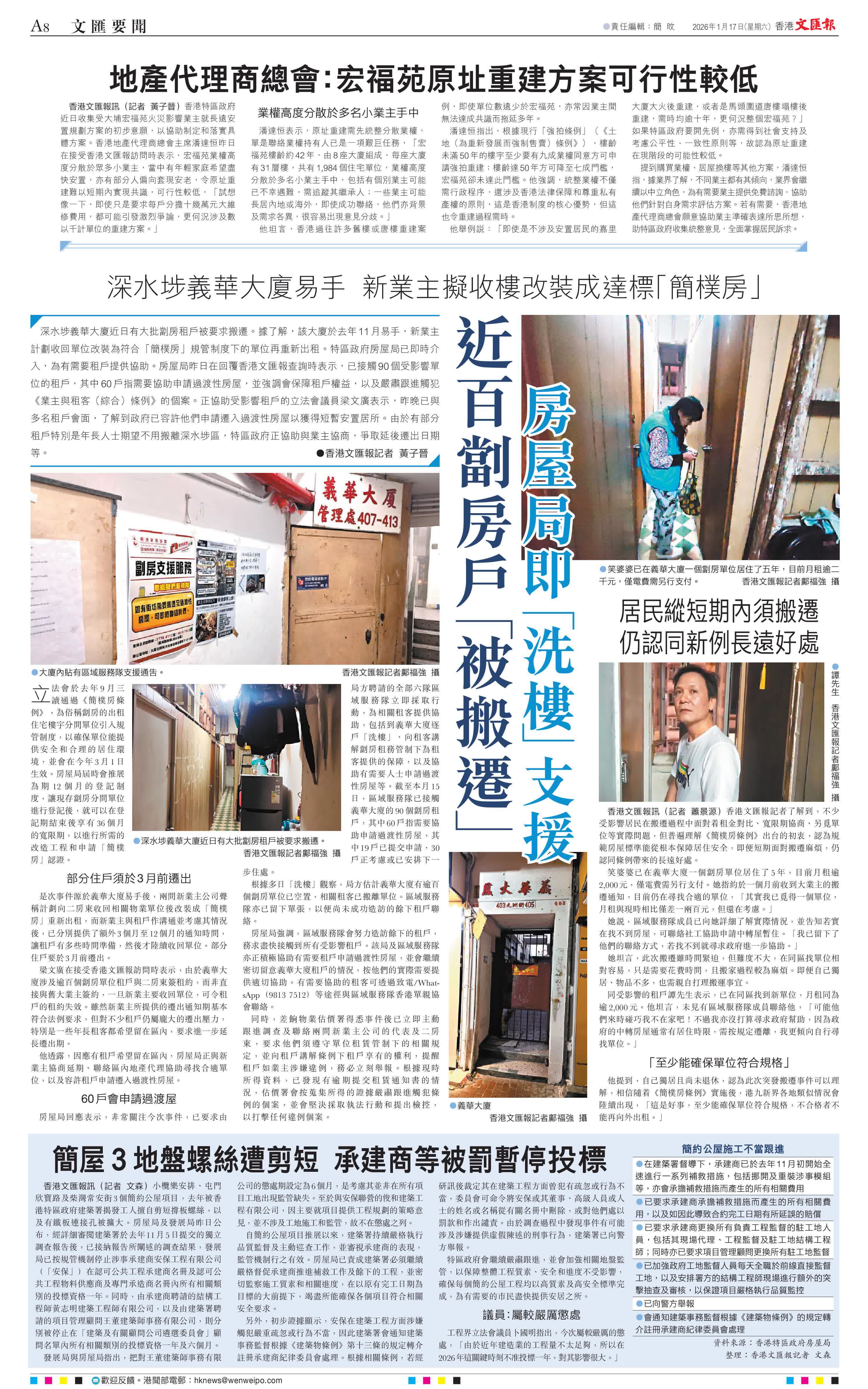 (香港文匯報記者 黃子晉)深水埗義華大廈近日有大批劏房租戶被要求搬遷。據了解,該大廈於去年11月易手,新業主計劃收回單位改裝為符合「簡樸房」規管制度下的單位再重新出租。特區政府房屋局已即時介入,為有需要租戶提供協助。房屋局昨日在回覆香港文匯報查詢時表示,已接觸90個受影響單位的租戶,其中60戶指需要協助申請過渡性房屋,並強調會保障租戶權益,以及嚴肅跟進觸犯《業主與租客(綜合)條例》的個案。正協助受影響租戶的立法會議員梁文廣表示,昨晚已與多名租戶會面,了解到政府已容許他們申請遷入過渡性房屋以獲得短暫安置居所。由於有部分租戶特別是年長人士期望不用搬離深水埗區,特區政府正協助與業主協商,爭取延後遷出日期等。