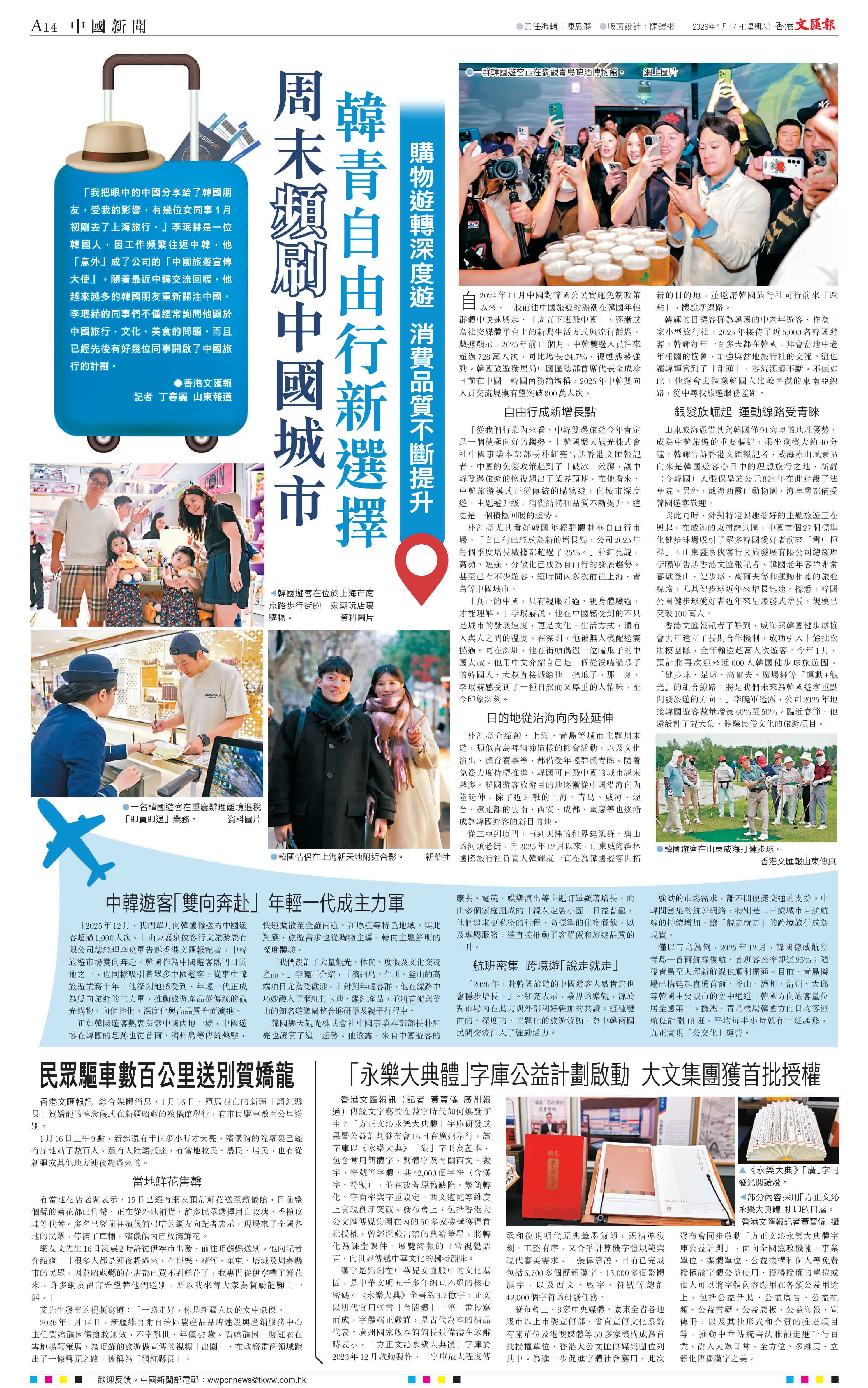 「2025年12月,我們單月向韓國輸送的中國遊客超過1,000人次。」山東盛泉俠客行文旅發展有限公司總經理李曉軍告訴香港文匯報記者,中韓旅遊市場雙向奔赴,韓國作為中國遊客熱門目的地之一,也同樣吸引着眾多中國遊客。從事中韓旅遊業務十年,他深刻地感受到,年輕一代正成為雙向旅遊的主力軍,推動旅遊產品從傳統的觀光購物,向個性化、深度化與高品質全面演進。