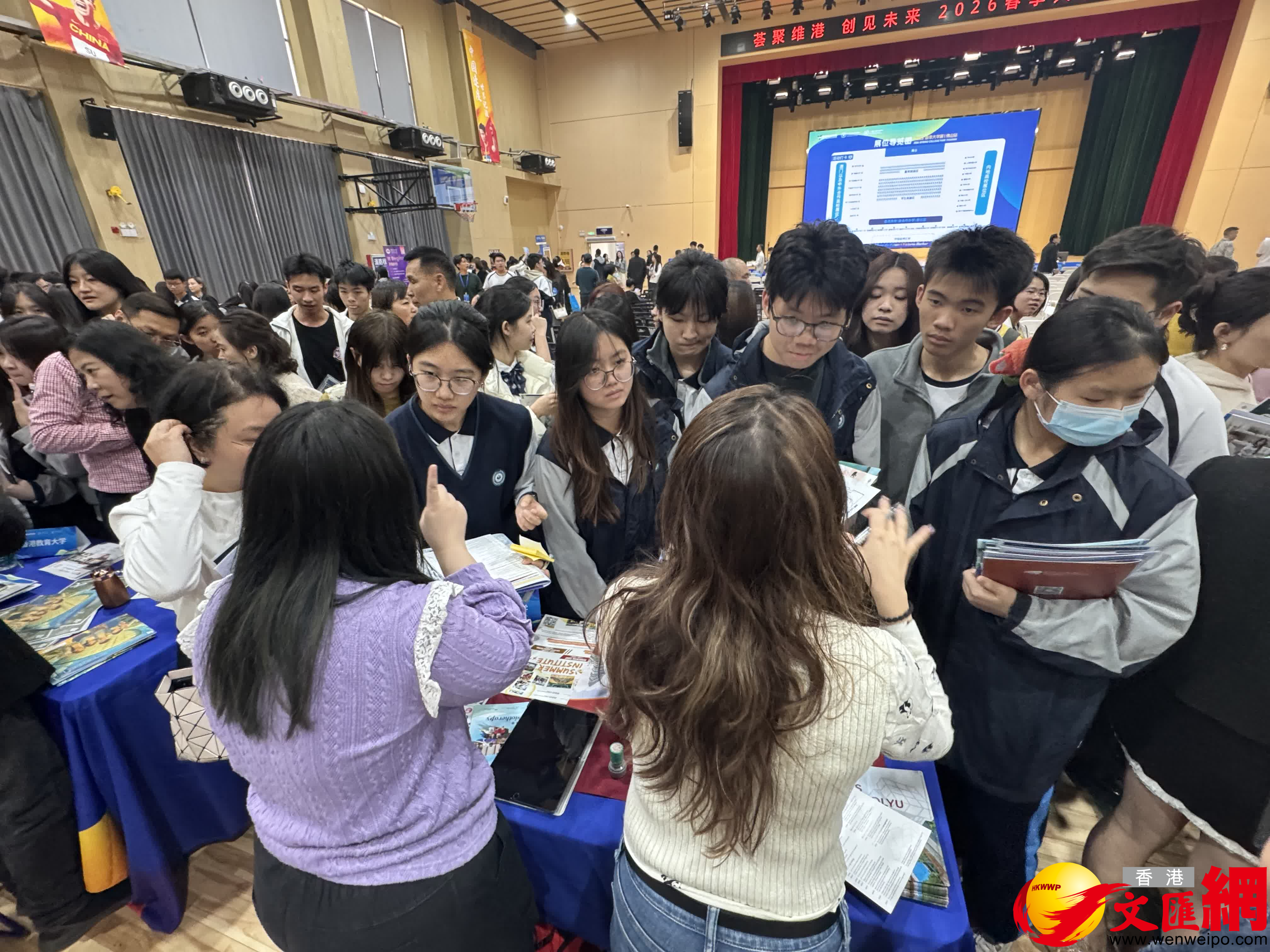 (香港文匯網記者 盧靜怡)首屆「薈聚維港·創見未來」2026春季大學展16日和17日一連兩日分別在佛山暨大港澳子弟學校和廣州暨大港澳子弟學校天河校區舉行,包括多所香港高校在內的逾30所高校到場設展,吸引不少在廣東就讀的港澳子弟學校學生及家長前來諮詢。記者現場看到,香港高校成為不少內地港澳學生的熱門選擇,他們普遍提早為升學作準備,關注焦點集中在學科優勢、學校排名、就業前景,以及學費和住宿等現實問題。「和老師面對面交流,我覺得可以更直觀地了解高校的入學條件和學科信息。」佛山暨大港澳子弟學校高一學生王祉莫說。