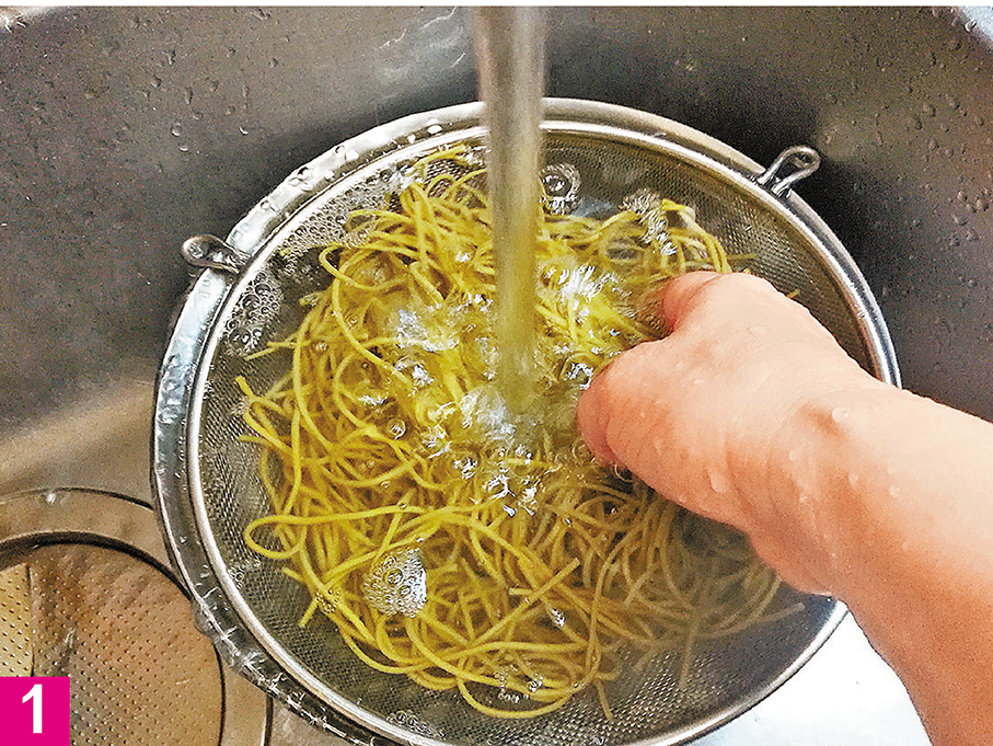 1. 蕎麥麵按包裝標示的時間煮軟後撈出,放清水沖洗,同時用手揉擦約1分鐘後至瀝乾,備用;