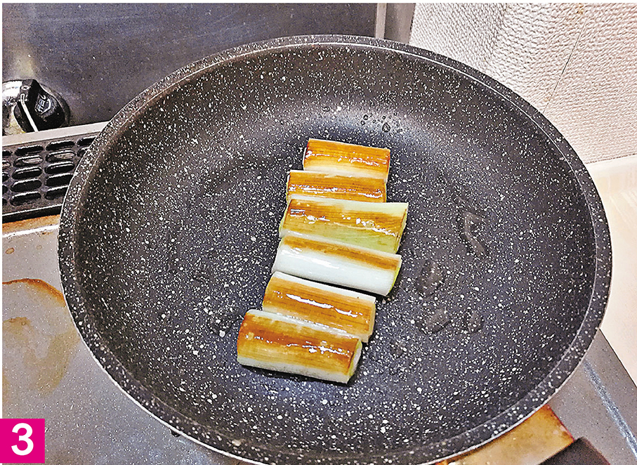3. 鑊內注入、以中火將大葱段烤至兩面焦香取出,備用;