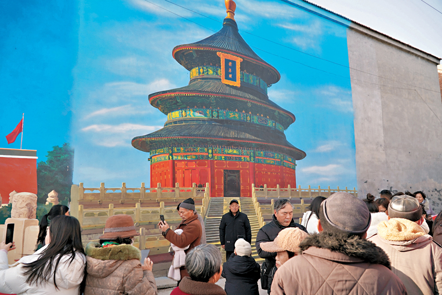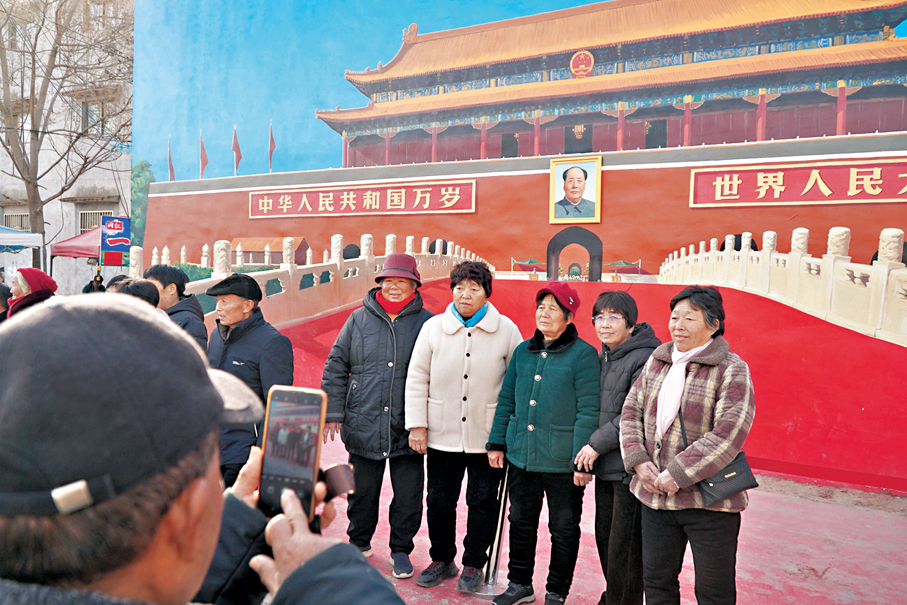 豫東商丘市晨陽和煦,不到九點的吳營村,煙火氣已漫過街巷。攤販陸續支攤就緒,「天安門」牆繪前,遊客舉着相機打卡、鄉親圍立閒談。「吳老師來了!」穿軍大衣、面色黝黑的吳承言一露面,便被人群圍住。他合照時必用大拇指比「讚」,咧嘴笑時,眼角紋路盛滿暖意。「眼前的熱鬧場景比我畫的任何畫都動人。」鄉村畫師吳承言對香港文匯報記者坦言,「我不是神筆馬良,也不是畫夢師,就是鄉村老人的孩子。老人們去不了的遠方,我用畫筆搬來;他們圓夢了開心了,村子又生機勃勃了,生活更有盼頭了。」