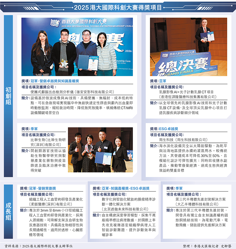 香港正積極建設國際創科中心,致力打造國際高端人才集聚高地,且一直以開放包容的生態,匯聚全球智慧、驅動創新突破。其中香港大學中國商業學院與該校科創中心聯合主辦的「2025香港大學國際科創大賽」昨日舉行總決賽,20支來自內地及海外的頂尖科創團隊競逐殊榮,最後,「初創組」有公司憑「便攜式顱腦出血檢測分析儀」包辦冠軍、營銷卓越獎與知識產權獎三項大獎;「成長組」有企業則以組織工程人工血管的研發及產業化,勇奪冠軍與營銷策劃獎,充分體現出團隊的創意與執行力。●文:香港文匯報記者 史柳藝 圖:香港文匯報記者 北山彥