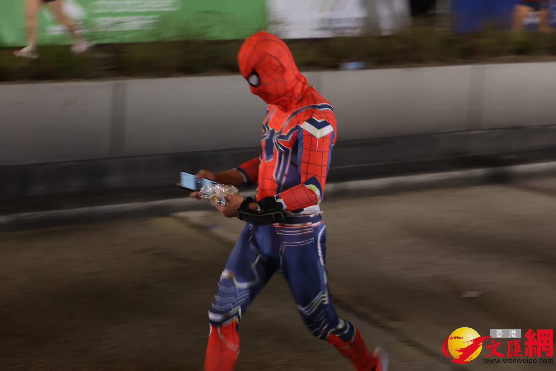 一年一度的跑界盛事渣打香港馬拉松2026今日(18日)舉行,本屆參賽跑手約7.4萬人,最早的半馬拉松挑戰組及十公里挑戰組,於清晨5時半分別從九龍尖沙咀彌敦道和東區走廊起步,並以維多利亞公園作為終點。記者現場所見,有市民扮演「蜘蛛俠」參加馬拉松。(香港文匯報記者 黃艾力 攝)
