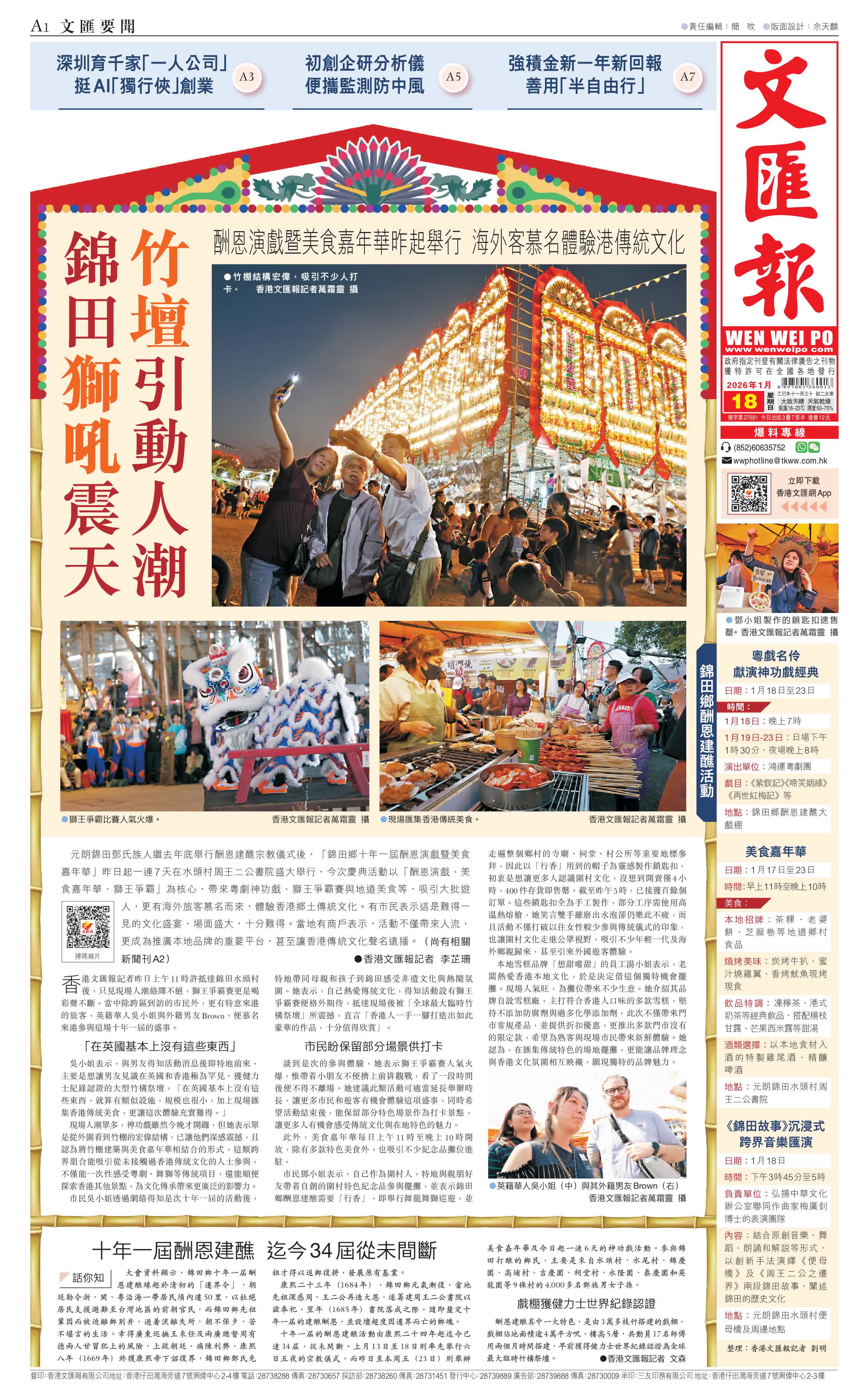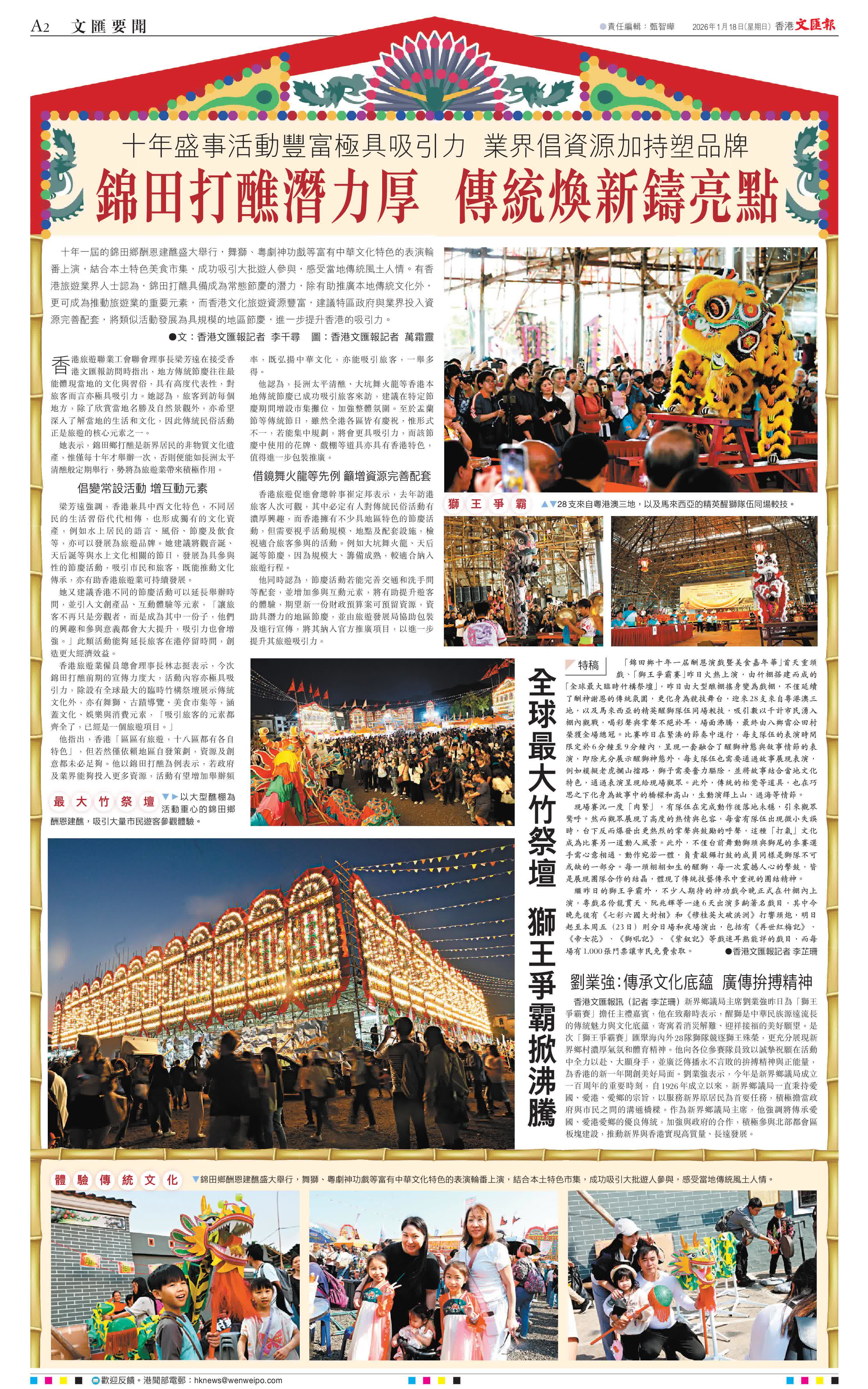 (香港文匯報記者 李芷珊)元朗錦田鄧氏族人繼去年底舉行酬恩建醮宗教儀式後,「錦田鄉十年一屆酬恩演戲暨美食嘉年華」昨日起一連7天在水頭村周王二公書院盛大舉行,今次慶典活動以「酬恩演戲、美食嘉年華、獅王爭霸」為核心,帶來粵劇神功戲、獅王爭霸賽與地道美食等,吸引大批遊人,更有海外旅客慕名而來,體驗香港鄉土傳統文化。有市民表示這是難得一見的文化盛宴,場面盛大,十分難得。當地有商戶表示,活動不僅帶來人流,更成為推廣本地品牌的重要平台,甚至讓香港傳統文化聲名遠播。