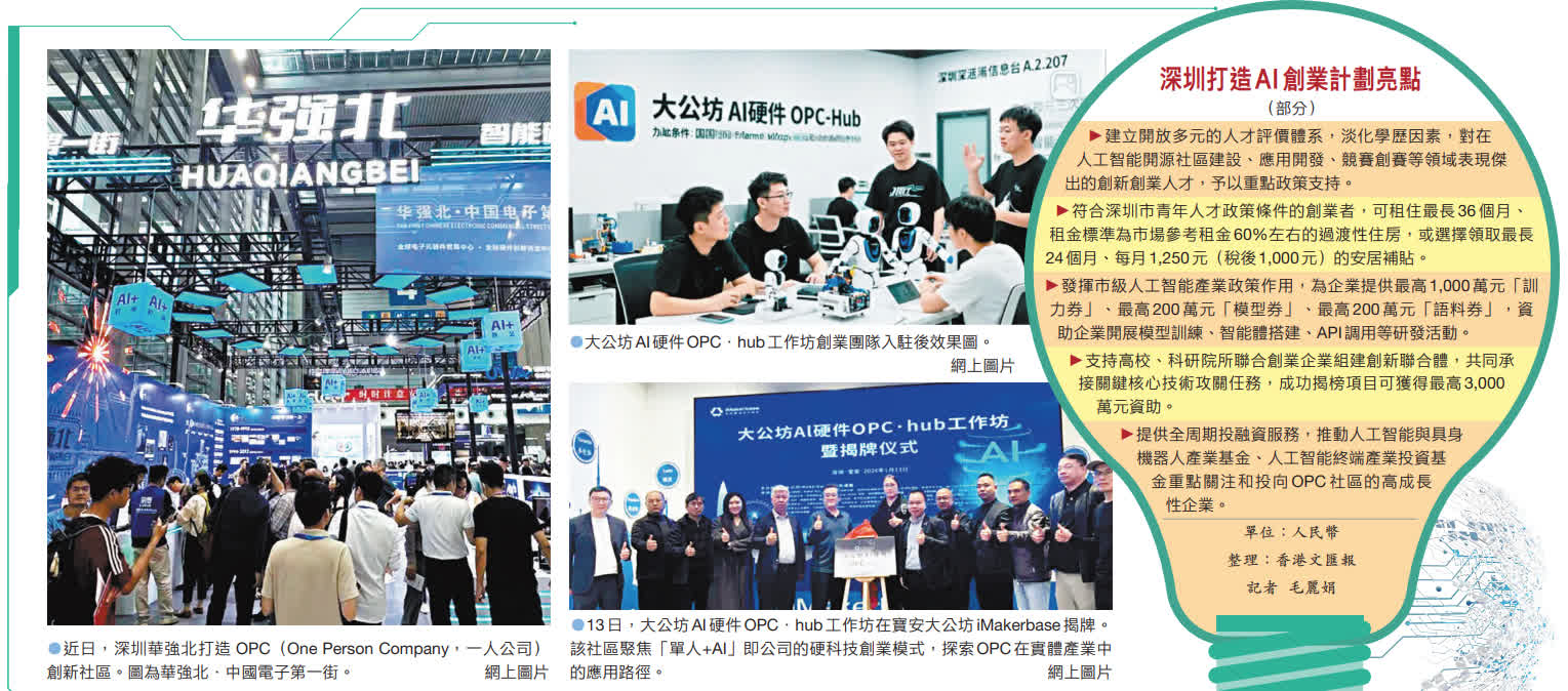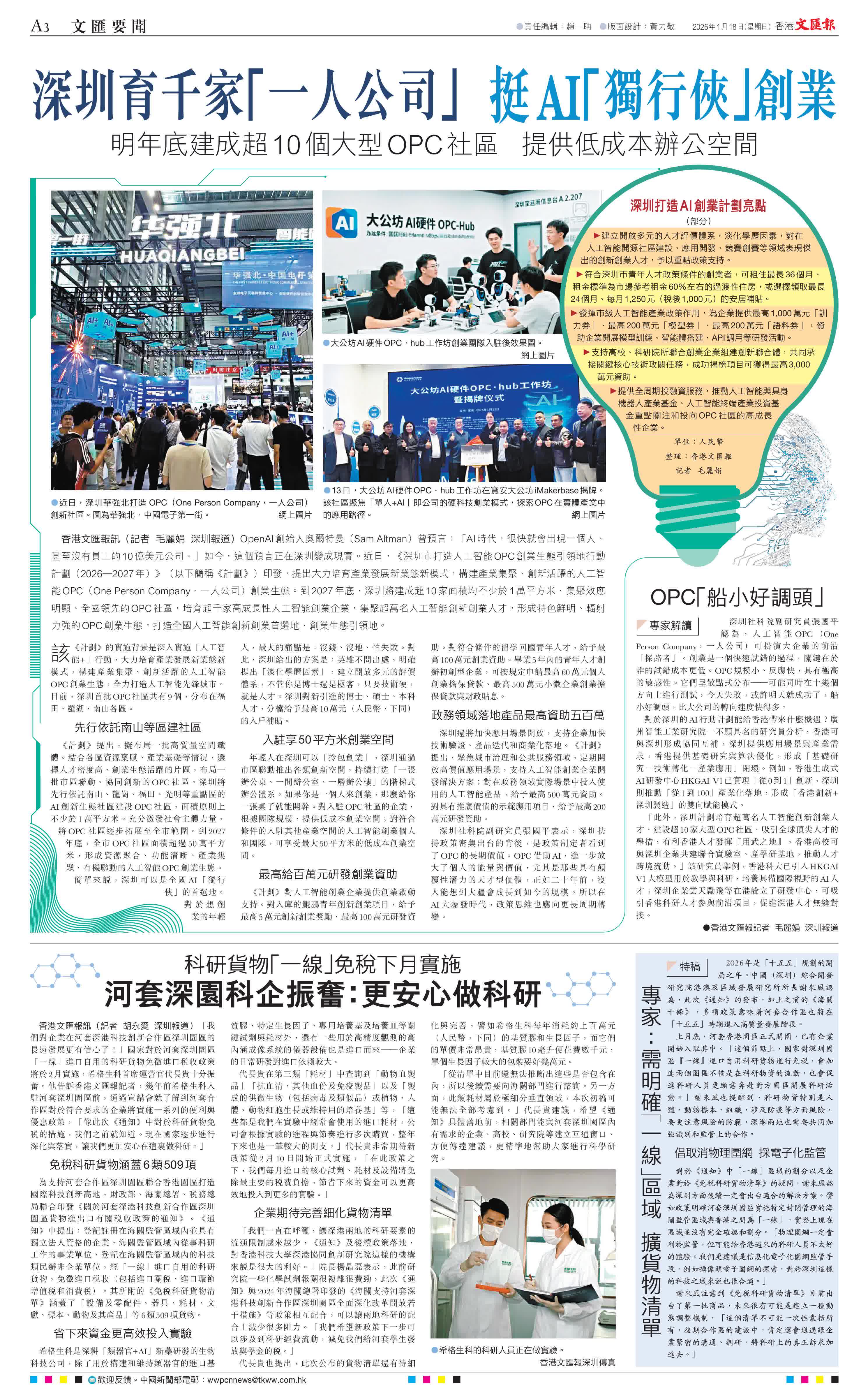 香港文匯報訊(記者 毛麗娟 深圳報道)OpenAI創始人奧爾特曼(Sam Altman)曾預言:「AI時代,很快就會出現一個人、甚至沒有員工的10億美元公司。」如今,這個預言正在深圳變成現實。近日,《深圳市打造人工智能OPC創業生態引領地行動計劃(2026—2027年)》(以下簡稱《計劃》)印發,提出大力培育產業發展新業態新模式,構建產業集聚、創新活躍的人工智能OPC(One Person Company,一人公司)創業生態。到2027年底,深圳將建成超10家面積均不少於1萬平方米、集聚效應明顯、全國領先的OPC社區,培育超千家高成長性人工智能創業企業,集聚超萬名人工智能創新創業人才,形成特色鮮明、輻射力強的OPC創業生態,打造全國人工智能創新創業首選地、創業生態引領地。