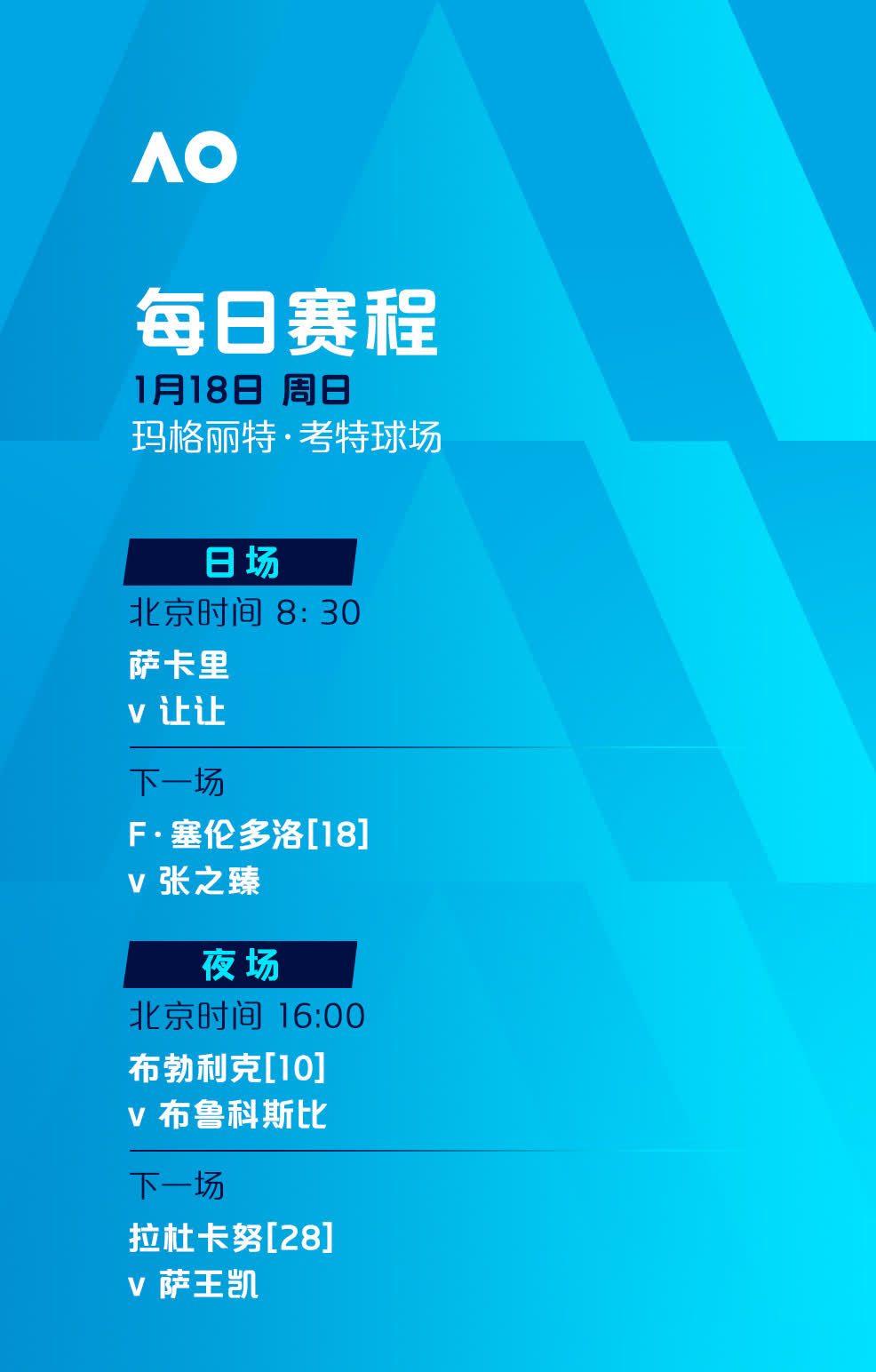 - 張之臻在網球聯合杯混合團體賽中復出並展現積極狀態。經歷傷病困擾的2025賽季後,他的世界排名有所下滑,本屆澳網首輪他將迎戰18號種子、阿根廷選手塞倫多洛。