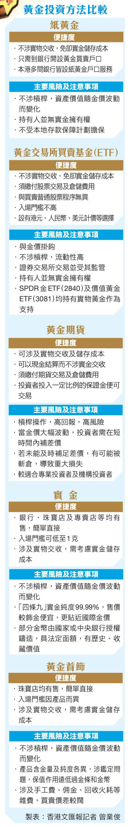 黃金投資產品方面,張智威首推黄金ETF(交易所買賣基金),特別推薦SPDR金ETF(2840),直言「買咗佢等於揸嚿實金」,好過其他如金礦股等「黃金概念股」,因為這些概念股有機會「玩財技」,例如發債、供股、配股等,建議投資者最好直接投資與黃金掛鈎的ETF。另一隻黃金ETF,FL二南方黃金(7299)亦值得投資者考慮,該ETF提供黃金期貨每日2倍槓桿,如果金價續升,就可為投資者帶來2倍升幅。