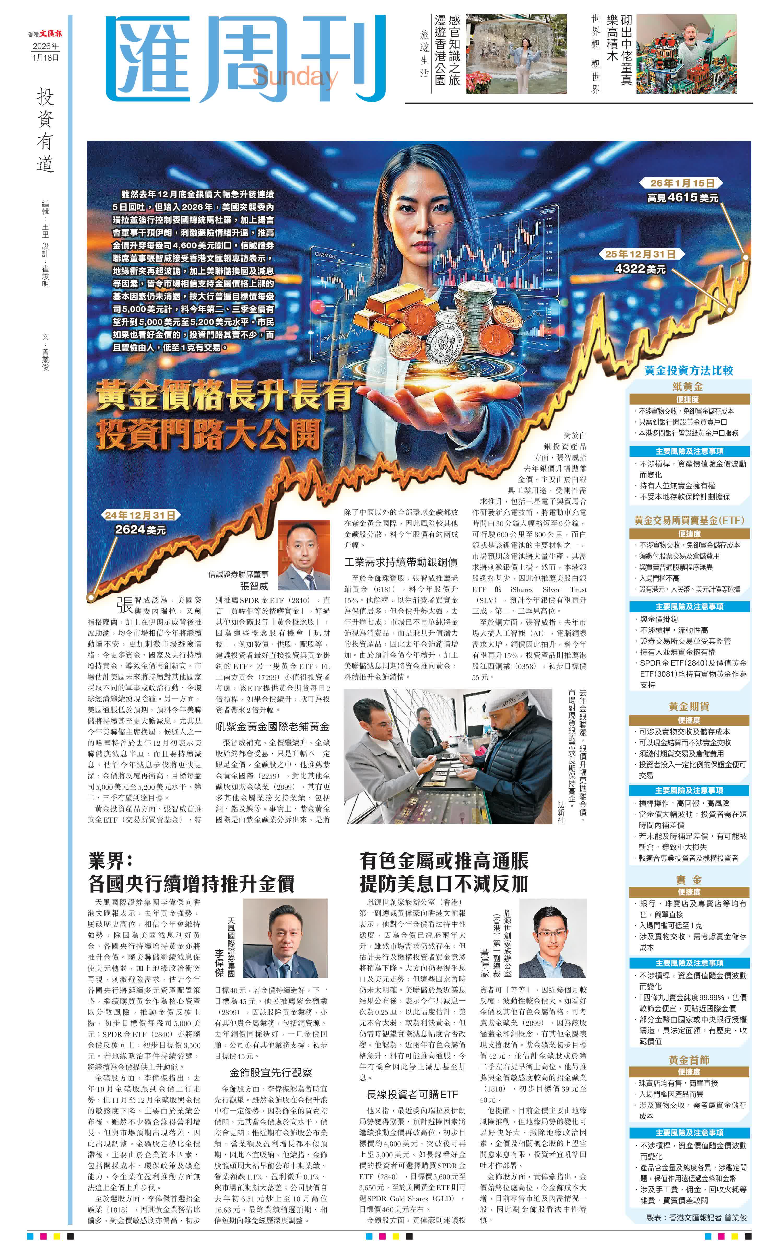 他又指,最近委內瑞拉及伊朗局勢變得緊張,預計避險因素將繼續推動金價再破高位,初步目標價約4,800美元,突破後可再上望5,000美元。如長線看好金價的投資者可選擇購買SPDR金ETF(2840),目標價3,600元至3,650元。至於美國黃金ETF則可選SPDR Gold Shares(GLD),目標價460美元左右。